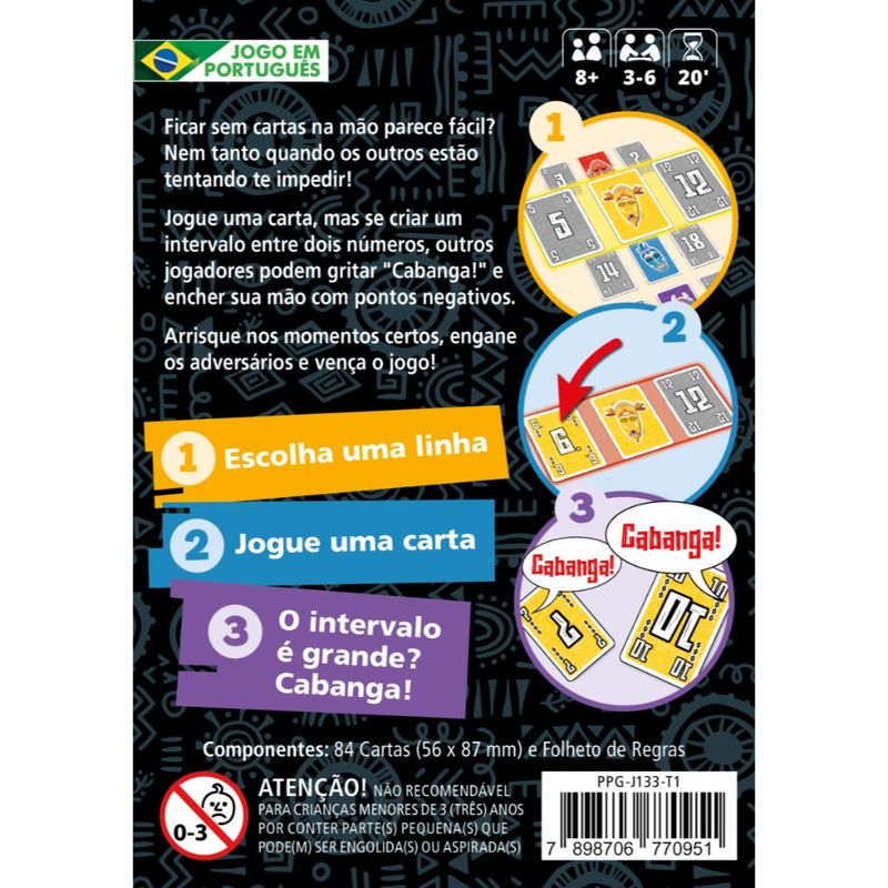 Em Cabanga! sua missão é se livrar das cartas da mão o mais rápido possível, jogando no momento certo e sem abrir brechas. Parece fácil? Pois é aí que os outros jogadores entram em ação! Com partidas dinâmicas e cheias de reviravoltas, Cabanga! é um jogo perfeito para desafiar os amigos e família.