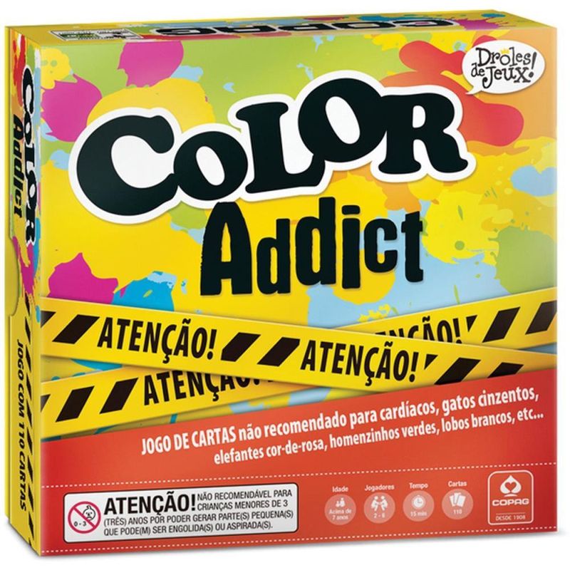 Com a família, com os amigos, no escritório, na escola ou no avião, você vai pirar em todas as cores! Livre-se de suas Cartas o mais rápido possível sobrepondo palavras, cores, os dois ou o oposto... Color Addict é um Jogo de Cartas não recomendad para cardíacos, gatos cinzentos, elefantes cor-de-rosa, homenzinhos verdes, lobos brancos, etc.