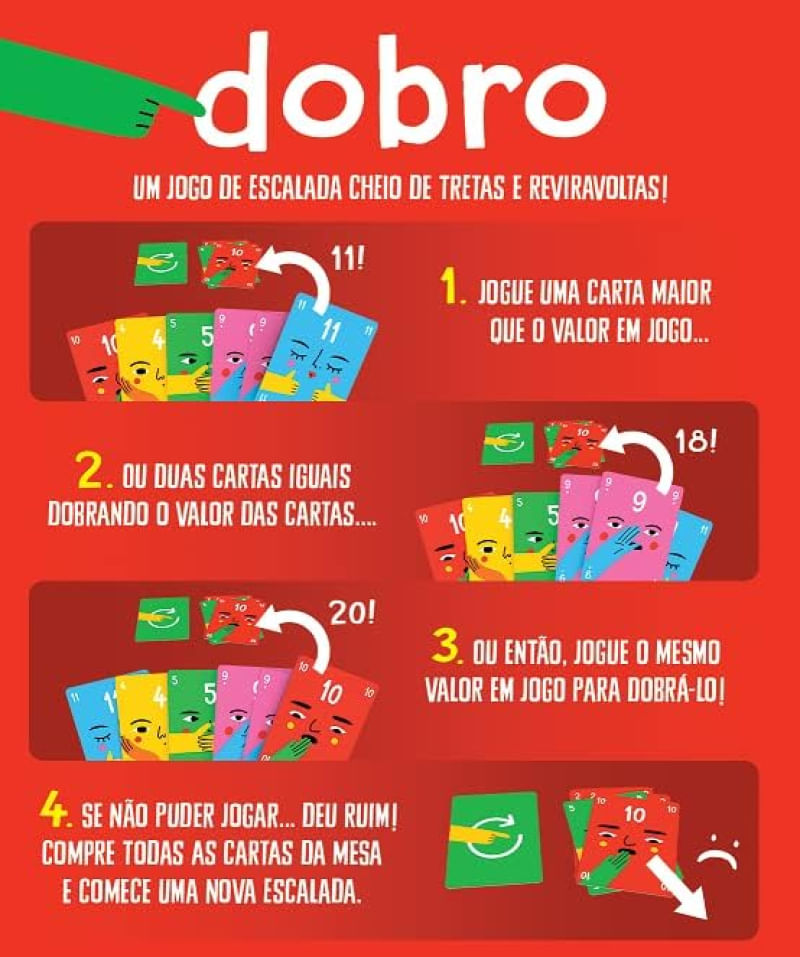 Dobro é um jogo de escalada onde, durante a partida os jogadores precisam jogar a carta igual ou maior a última jogada na mesa, caso a carta for igual, ela dobra. Caso não possa jogar uma carta, pega todas as cartas como pontos negativos