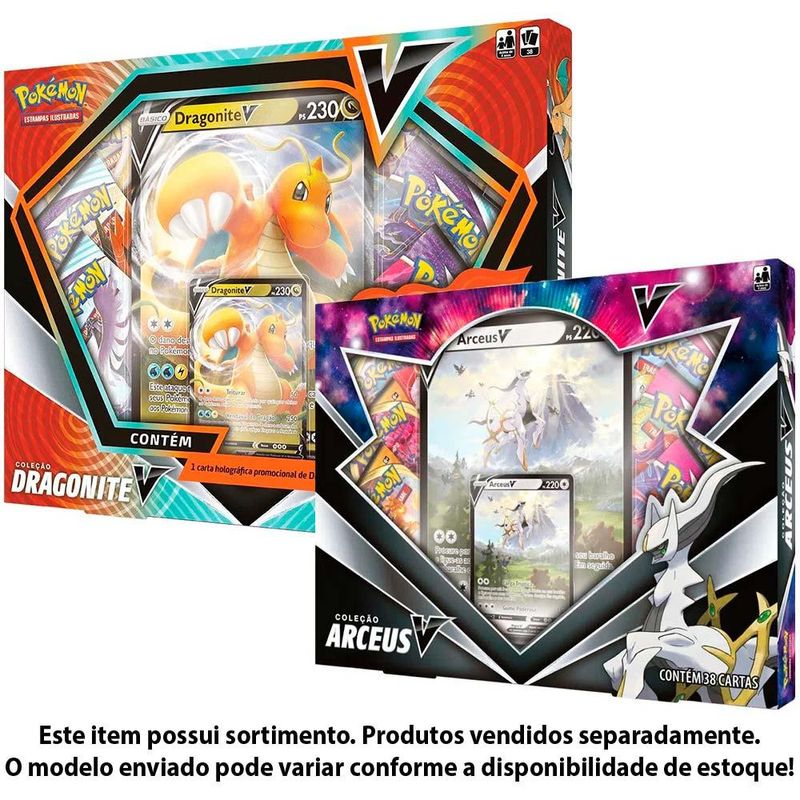Jogo de Cartas - Pokemon - Colecao Sortida - Pokemon V Sortido - Copag: Atinja poderes supremos com Arceus V ou lidere os Pokemon de tipo dragao a vitoria com Dragonite V! Batalhe com o majestoso Pokemon Alfa que esta pronto para aumentar o poder da sua equipe ou conheca mais sobre Dragonite V, um dos Pokemon mais inteligentes e poderosos capazes de dar a volta ao mundo em menos de um dia. Ambas as colecoes sao perfeitas para o treinador que busca por poder, contendo uma super carta holografica promocional sortida, pacotes de booster do Pokemon Estampas Ilustradas, entre outros itens raros e promocionais! Vamos capturar todos! • Detalhes - Este produto possui sortimento. - O modelo enviado pode variar conforme a disponibilidade de estoque - Cada box de carta e vendido separadamente - Pratico, chamativo e divertido - 38 otimas cartas para sua colecao - Variacoes de cartas e estrategias - Linda combinacao chamativa de cores - Materiais confeccionados de alta qualidade - 1 carta grande de 133mm x 187mm - Box inteiramente inspirado nos Pokemon mais iconicos da franquia - Cartas Holograficas promocionais - Tipo de rareza: Promocional INFORMACOES: • Produto: Jogo de cartas Pokemon Box Pokemon V sortido • Colecao: Sortida • Marca: Copag • Cores: Estampado • Tipo: Jogo de Baralho • Categoria: Jogo de Cartas • Dimensoes (Carta) (C x A): 63 x 88 mm • Dimensao (Carta extragrande) (C x A): 133 x 187 mm • Conteudo: 01 carta holografica promocional sortida, 01 carta extragrande sortida, 06 pacotes de booster do Pokemon Estampas Ilustradas e 01 carta codificada Pokemon Estampas Ilustradas Live • Cada jogador deve ter um baralho de 60 cartas de Pokemon para jogar. • Recomendacao: para criancas maiores de 04 anos de idade ESPECIFICACOES: • Referencia: 30748 (SORTIMENTO) • Codigo de Barras: 7896192307477 • Embalagem (C x A x L): 29 x 22 x 03 cm • Embalagem (Peso): 0,245 kg • Material / Composicao: Papel cartonado • Registro: 008 140/2021 • Certificado: Orgaos Autorizados - OCP´S (Organismos de Certificacao de Produtos) BENEFICIOS DE BRINCAR: - Eleva a autoestima - Exercita a memoria - Estimula o raciocinio - Exercita o imaginario - Desenvolve a criatividade - Desenvolve percepcao visual - Desperta a atencao e curiosidade - Desenvolvimento neuropsicologico - Estimula habilidades motoras basicas - Incentiva a comunicacao e linguagem - Desenvolve aspectos emocionais e afetivo - Estimula o reconhecimento de formas e cores AVISO: - As imagens sao meramente ilustrativas - Os tamanhos e medidas sao aproximados - As cores e estampas dos produtos podem ter variacoes - As informacoes sao de responsabilidade do fabricante ou fornecedor