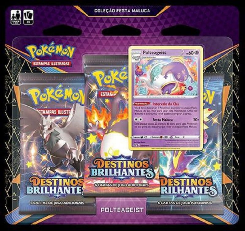 Pokémon EE4.5 Blister Triplo - Destinos Brilhantes. Coleção Festa maluca. A Festa maluca Já Começou. Balance o esqueleto com Mr. Rime de galar; Dance de maneira eletrizante com Dedenne; Tome uma xícara de chá com Polteageists; ou Junte-se a Bunnelby em uma festa do barulho nessa coleção.