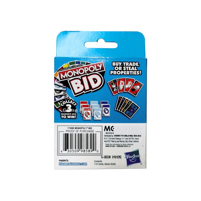 Diversão para famílias e amigos com este jogo Monopoly rápido. O jogo Monopoly Leilão é um jogo de sorte e estratégia no qual os jogadores dão lances em leilões, pagam com cartas de dinheiro, roubam propriedades com cartas de ação e mudam a partida com cartas coringas. A cada turno, um jogador fara o leilão. Prontos para dar lances? Todos os jogadores dizem ao mesmo tempo "1, 2, 3, Hora do lance!" e revelam a carta de dinheiro. O maior lance leva a propriedade. O primeiro jogador a agrupar 3 conjuntos de propriedades é o vencedor. Este jogo Monopoly rápido é uma ótima escolha para noite de jogos, festas e atividades com crianças a partir de 7 anos.