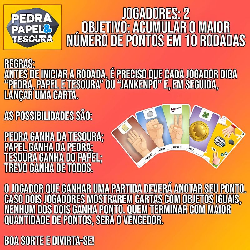 Jogo de Cartas Pedra, Papel e Tesoura – Pais & Filhos O tradicional jogo de Pedra, Papel e Tesoura agora em uma versão em cartas, ideal para crianças a partir de 4 anos. Dinâmico e fácil de jogar, estimula o raciocínio lógico, atenção e coordenação motora. O objetivo é simples: identificar rapidamente o símbolo vencedor entre as cartas e realizar o gesto correspondente com as mãos. Vence o jogador que acumular mais cartas ao final da partida. Especificações do Produto: Marca: Pais & Filhos Modelo: 791934 EAN: 7908470019344 Material: Papelão Idioma: Português Número de jogadores: 2 Idade recomendada: A partir de 4 anos Dimensões: 13 x 9 x 2 cm Ideal para momentos de lazer em família ou entre amigos, proporcionando diversão e aprendizado ao mesmo tempo.