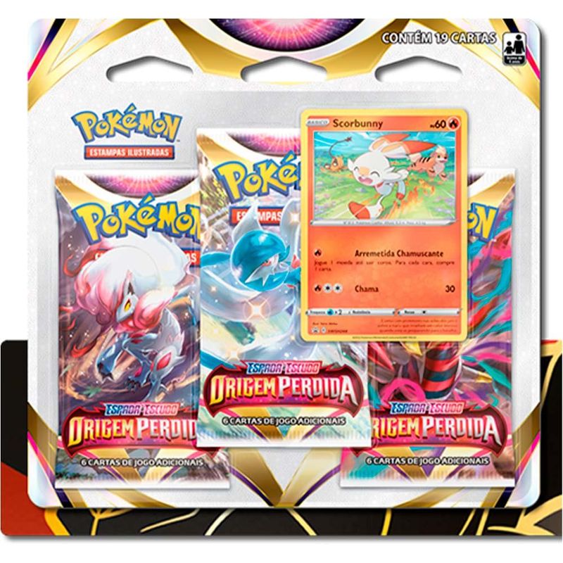 Jogo de Cartas Pokemon - Blister Triplo - EE - Origem Perdida - Scorbunny - Copag: Conheca a nova colecao de Pokemon Estampas Ilustradas, Origem Perdida! Uma colecao que traz o retorno da mecanica de Zona Perdida, e a continuacao da tao aclamada Galeria de Treinadores. De um impulso na sua colecao! Participe da mais nova acao do Pokemon Estampas Ilustradas com tres pacotes de booster incriveis da colecao Origem Perdida com uma carta especial de Scorbunny, Pokemon de fogo com que usa sua poderosa habilidade Arremetida Chamuscante! Vamos capturar todos! Detalhes • 19 cartas para sua colecao • Variacoes de cartas e estrategias • Colecao exclusiva do Pokemon Espada e Escudo • Carta especial de Scorbunny • Embalagem inteiramente inspirada em Pokemon Estampas Ilustradas INFORMACOES: • Produto: Jogo de Cartas Blister Triplo Scorbunny • Marca: Copag • Colecao: Pokemon Origem Perdida • Linha: Pokemon Estampas Ilustradas • Serie: Espada e Escudo • Tipo: Jogo de Cartas Colecionaveis • Ocasiao de Jogo: para jogar ou montar um deck • Jogadores: 2 ou mais participantes • Tempo de jogo: 30 minutos • Tamanho das cartas: 63mm x 88mm • Conteudo: 19 unidades de cartas Pokemon • Recomendacao: para criancas maiores de 04 anos de idade ESPECIFICACOES: • Referencia: 31658 • Codigo de Barras: 7896192316578 • Embalagem (C x A x L): 19 x 19 x 0,8 cm • Embalagem (Peso): 0,070 kg • Material / Composicao: Papel e plastico • Registro: 008 140/2021 • Certificado: Orgaos Autorizados - OCP´S (Organismos de Certificacao de Produtos) BENEFICIOS DE BRINCAR: • Eleva a autoestima • Exercita a memoria • Estimula o raciocinio • Exercita o imaginario • Desenvolve a criatividade • Desenvolve percepcao visual • Desperta a atencao e curiosidade • Desenvolvimento neuropsicologico • Estimula habilidades motoras basicas • Incentiva a comunicacao e linguagem • Desenvolve aspectos emocionais e afetivo • Estimula o reconhecimento de formas e cores AVISO: • As imagens sao meramente ilustrativas • Os pesos, tamanhos e medidas sao aproximados • As cores e estampas dos produtos podem ter variacoes • As informacoes sao de responsabilidade do fabricante ou fornecedor
