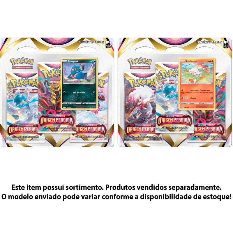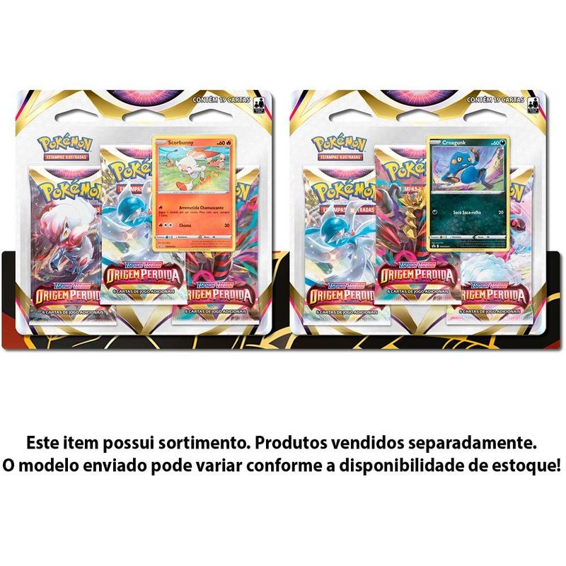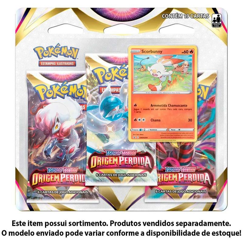 Jogo de Cartas Pokemon - Blister Triplo - EE - Origem Perdida - Sortido - Copag: Conheca a nova colecao de Pokemon Estampas Ilustradas, Origem Perdida! Uma colecao que traz o retorno da mecanica de Zona Perdida, e a continuacao da tao aclamada Galeria de Treinadores. De um impulso na sua colecao! Participe da mais nova acao do Pokemon Estampas Ilustradas com tres pacotes de booster incriveis da colecao Origem Perdida, uma carta especial de Croagunk, Pokemon lutador venenoso com o incrivel golpe Soco Saca-rolha ou uma carta especial de Scorbunny, Pokemon de fogo com que usa sua poderosa habilidade Arremetida Chamuscante! Vamos capturar todos! Detalhes • Este produto possui sortimento • O modelo enviado pode variar conforme a disponibilidade de estoque • Cada conjunto de cartas e vendido separadamente • 19 cartas para sua colecao • Variacoes de cartas e estrategias • Colecao exclusiva do Pokemon Espada e Escudo • Carta especial de Croagunk ou Scorbunny • Embalagem inteiramente inspirada em Pokemon Estampas Ilustradas INFORMACOES: • Produto: Jogo de Cartas Blister Triplo Sortido • Marca: Copag • Colecao: Pokemon Origem Perdida • Linha: Pokemon Estampas Ilustradas • Serie: Espada e Escudo • Tipo: Jogo de Cartas Colecionaveis • Ocasiao de Jogo: para jogar ou montar um deck • Jogadores: 2 ou mais participantes • Tempo de jogo: 30 minutos • Tamanho das cartas: 63mm x 88mm • Conteudo: 19 unidades de cartas Pokemon • Recomendacao: para criancas maiores de 04 anos de idade ESPECIFICACOES: • Referencia: 31658 • Codigo de Barras: 7896192316578 • Embalagem (C x A x L): 19 x 19 x 0,8 cm • Embalagem (Peso): 0,070 kg • Material / Composicao: Papel e plastico • Registro: 008 140/2021 • Certificado: Orgaos Autorizados - OCP´S (Organismos de Certificacao de Produtos) BENEFICIOS DE BRINCAR: • Eleva a autoestima • Exercita a memoria • Estimula o raciocinio • Exercita o imaginario • Desenvolve a criatividade • Desenvolve percepcao visual • Desperta a atencao e curiosidade • Desenvolvimento neuropsicologico • Estimula habilidades motoras basicas • Incentiva a comunicacao e linguagem • Desenvolve aspectos emocionais e afetivo • Estimula o reconhecimento de formas e cores AVISO: • As imagens sao meramente ilustrativas • Os pesos, tamanhos e medidas sao aproximados • As cores e estampas dos produtos podem ter variacoes • As informacoes sao de responsabilidade do fabricante ou fornecedor