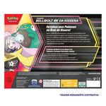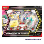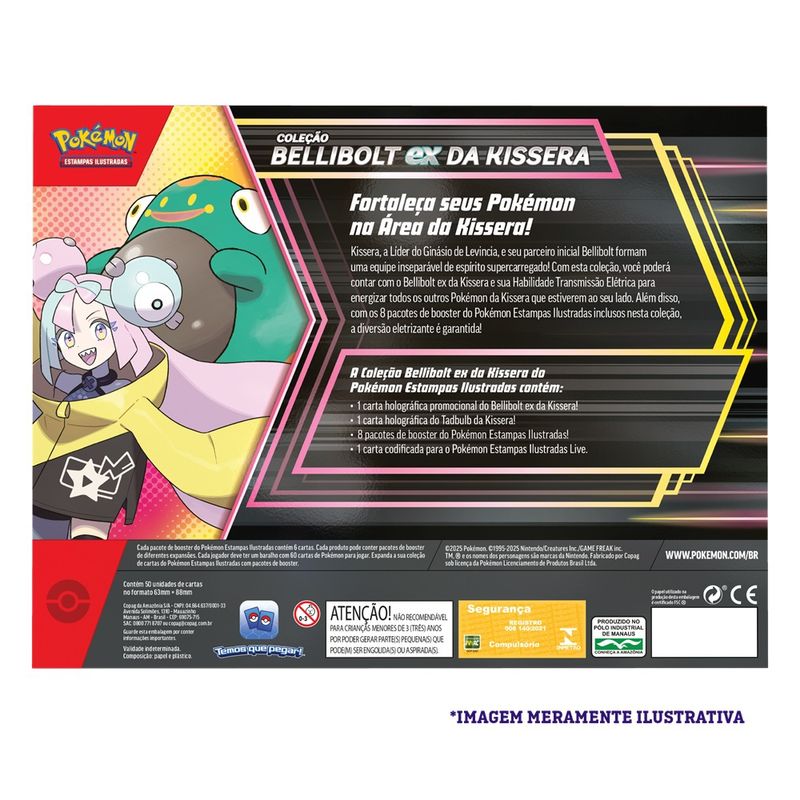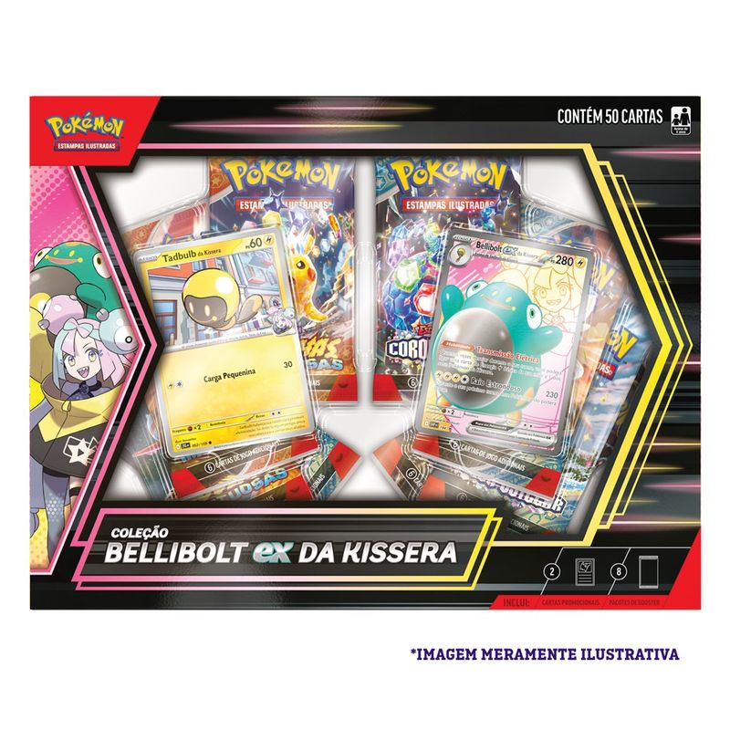 Kissera, a Líder do Ginásio de Levincia, e seu parceiro inicial Bellibolt formam uma equipe inseparável de espírito supercarregado! Com esta coleção, você poderá contar com o Bellibolt ex da Kissera e sua Habilidade Transmissão Elétrica para energizar todos os outros Pokémon da Kissera que estiverem ao seu lado. Além disso, com os 8 pacotes de booster do Pokémon Estampas Ilustradas inclusos nesta coleção, a diversão eletrizante é garantida!"