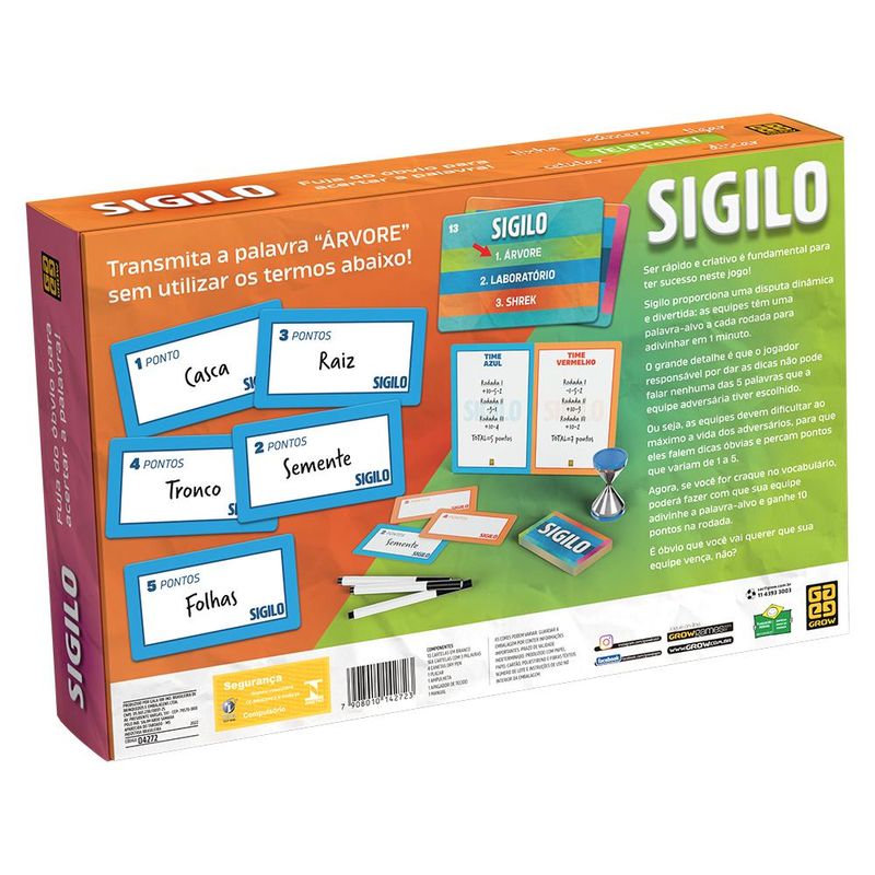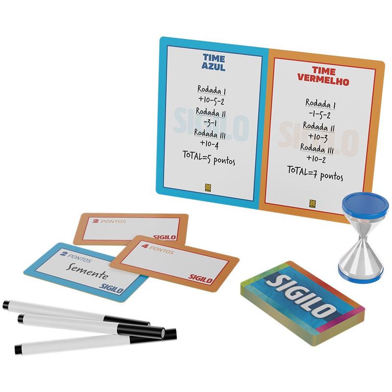 Ser rápido e criativo é fundamental para ter sucesso neste jogo! Sigilo proporciona uma disputa dinâmica e divertida: as equipes têm uma palavra-alvo a cada rodada para adivinhar em 1 minuto. O grande detalhe é que o jogador responsável por dar as dicas não pode falar nenhuma das 5 palavras que a equipe adversária tiver escolhido. Ou seja, as equipes devem dificultar ao máximo a vida dos adversários, para que eles falem dicas óbvias e percam pontos que variam de 1 a 5. Agora, se você for craque no vocabulário, poderá fazer com que sua equipe adivinhe a palavra-alvo e ganhe 10 pontos na rodada. É óbvio que você vai querer sua equipe vença, não?