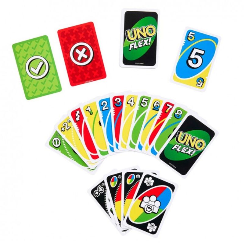O UNO Flex Card Game é baseado no UNO Card Game que os jogadores conhecem e amam, mas com uma atitude flexível. Cartas especiais permitem que os jogadores mudem a cor de uma carta para fazer uma combinação – um 4 Vermelho pode se tornar um 4 Verde em uma flexão.