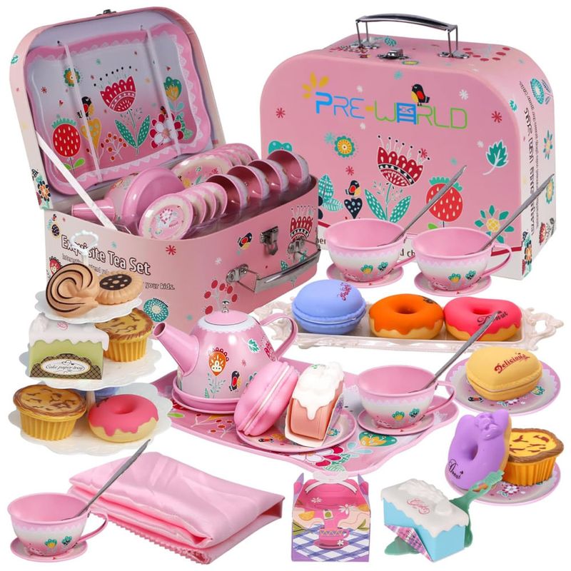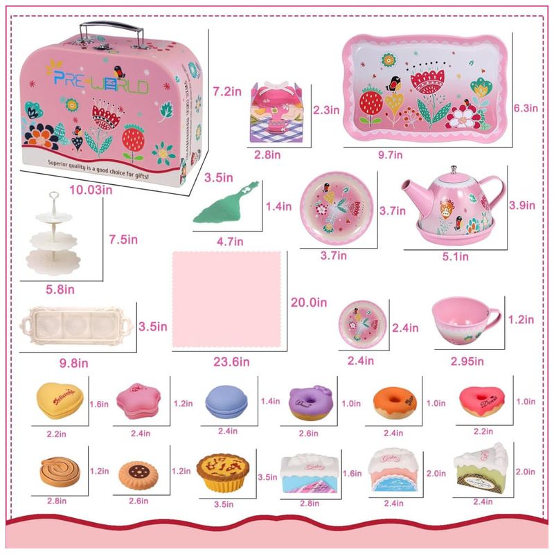 Feito de material de ferro revestido de estanho não tóxico, com acessórios para sobremesas em plástico inofensivo, este conjunto oferece qualidade premium e resistência à corrosão. A toalha de mesa fofa feita de poliéster pode ser facilmente dobrada para armazenamento com economia de espaço. As cenas realistas criam uma verdadeira festa do chá para as crianças se divertirem.