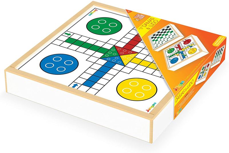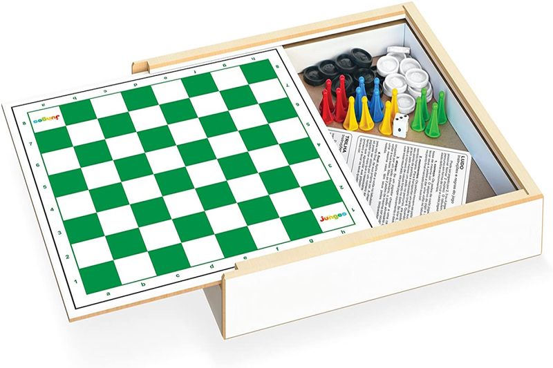 Conteúdo: 1 tabuleiro, 24 peças para jogas Damas, 16 peças e 1 dado para jogar Ludo.