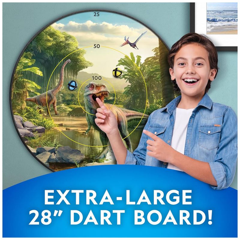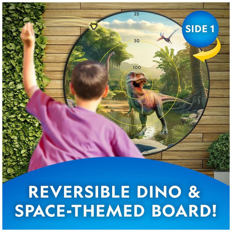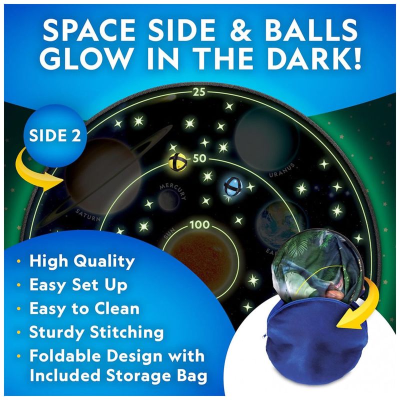 Componentes Inclusos: Alvo reversível de 71cm que brilha no escuro com temas de dinossauros e sistema solar, 2 bolas espaçadoras, Suporte de ventosa, Bolsa de armazenamento, 16 bolas de dardo que brilham no escuro,