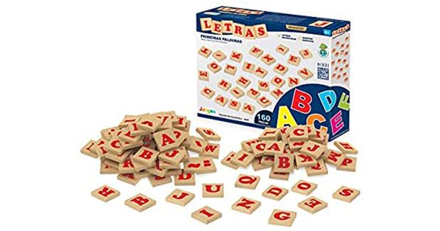 Letras da Junges com 160 peças em madeira de reflorestamento (MDF) 6mm, tamanho de 3x3cm impressas em serigrafia, com letras maiúsculas e acentos gráficos do alfabeto português. Contém 4 alfabetos completo mais letras extras / vogais e acentos gráficos. Ideal para alfabetização. Formando Palavras! Embalagem: caixa litografada