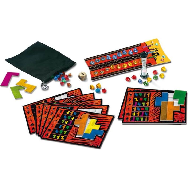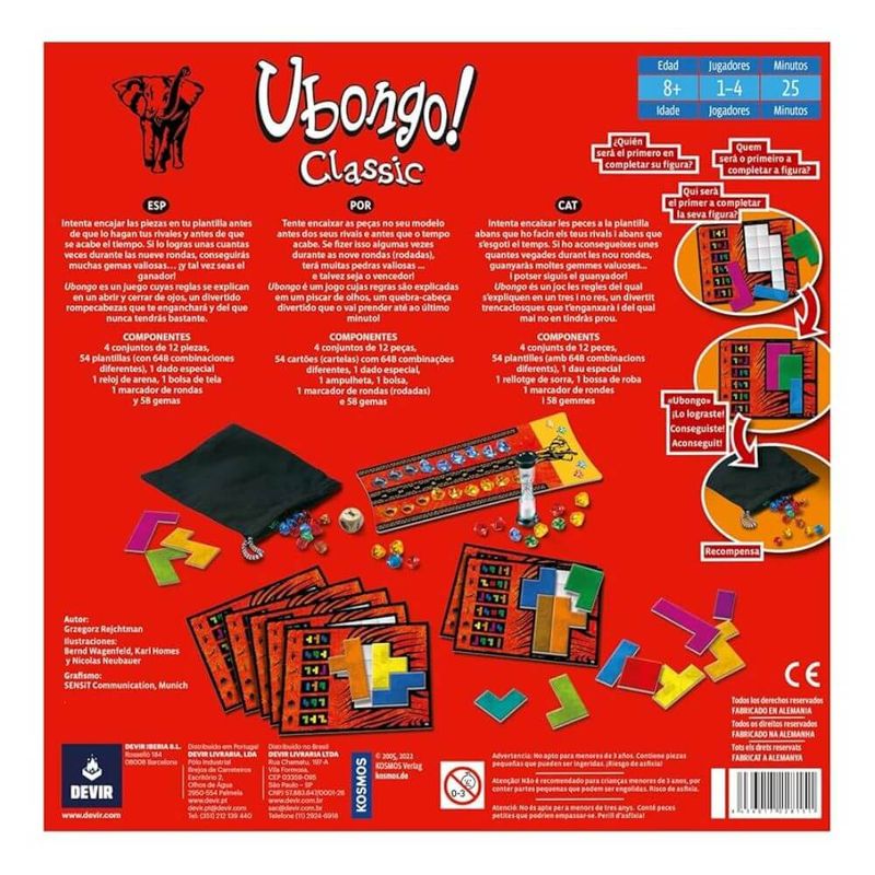 Emocionante porque todos os jogadores tentam encaixar as peças na sua cartela ao mesmo tempo. Viciante porque depois de começar você não conseguirá mais parar e esperará por cada nova rodada impacientemente. E inteligente porque as regras de Ubongo podem ser explicadas em menos de 3 minutos.