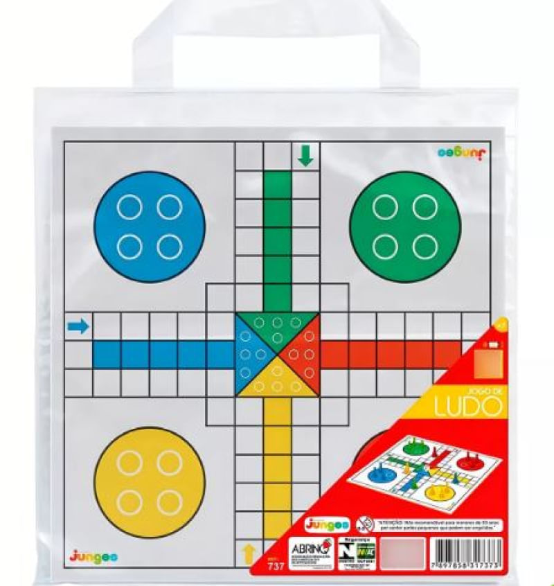 Jogo tradicional de Ludo com tabuleiro em MDF com 28,5x28,5 cm.Acompanha kit de peças plásticas do ludo com dado 14mm e regras do jogo.Embalagem: Sacola PVC com alçaIdade Recomendada: +7 anos