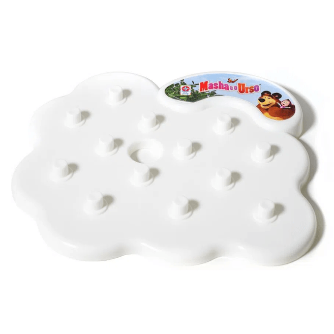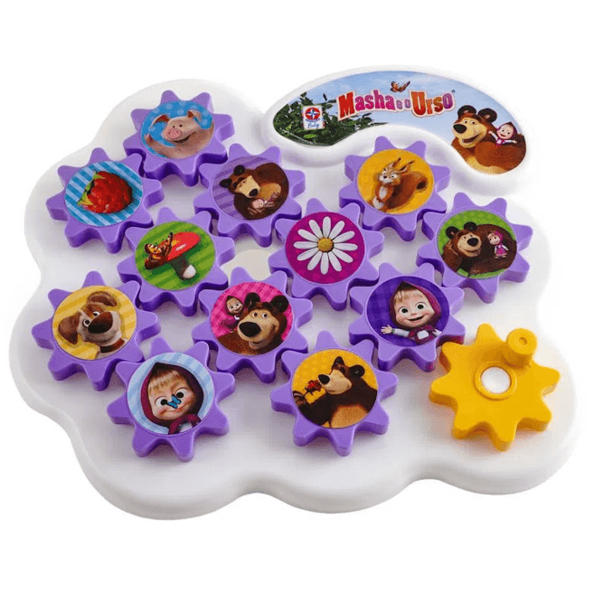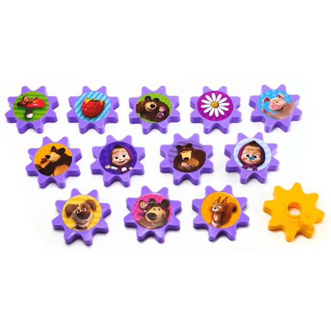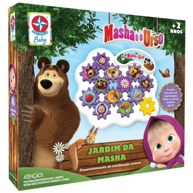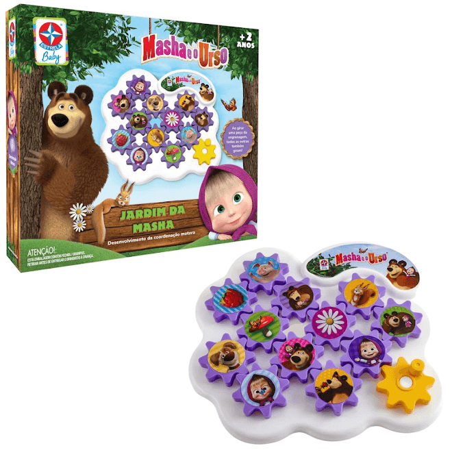 Um jardim com imagens da Masha e o Urso que vai entreter as crianças. Basta encaixar como quiser as roldanas e girar na alavanca para ver as imagens se movimentarem e tornar tudo mais divertido.