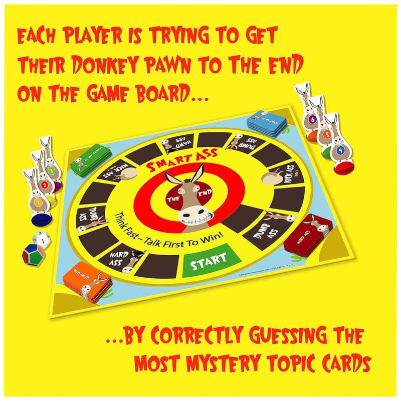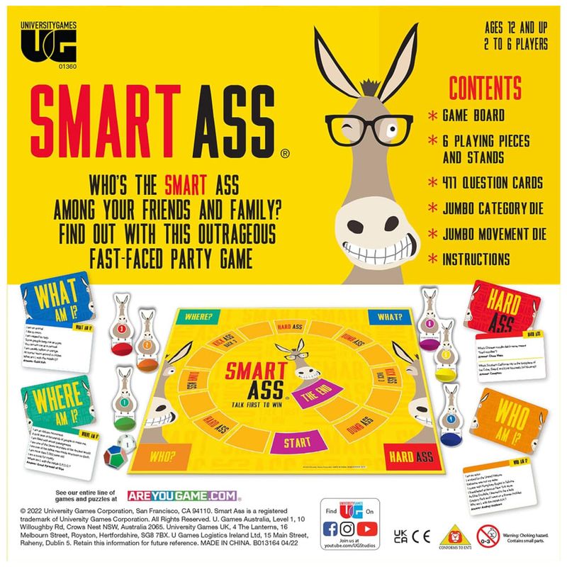 O jogo permite que você grite sua resposta mesmo fora de sua vez. Seja o mais rápido a responder às perguntas sobre quem, o que e onde estou, e avance para ser coroado o melhor Smart Ass. O jogo inclui um tabuleiro de jogo, 6 peças de jogo com suportes, 411 cartões de perguntas, um dado de categoria Jumbo, um dado de movimento Jumbo e instruções detalhadas.