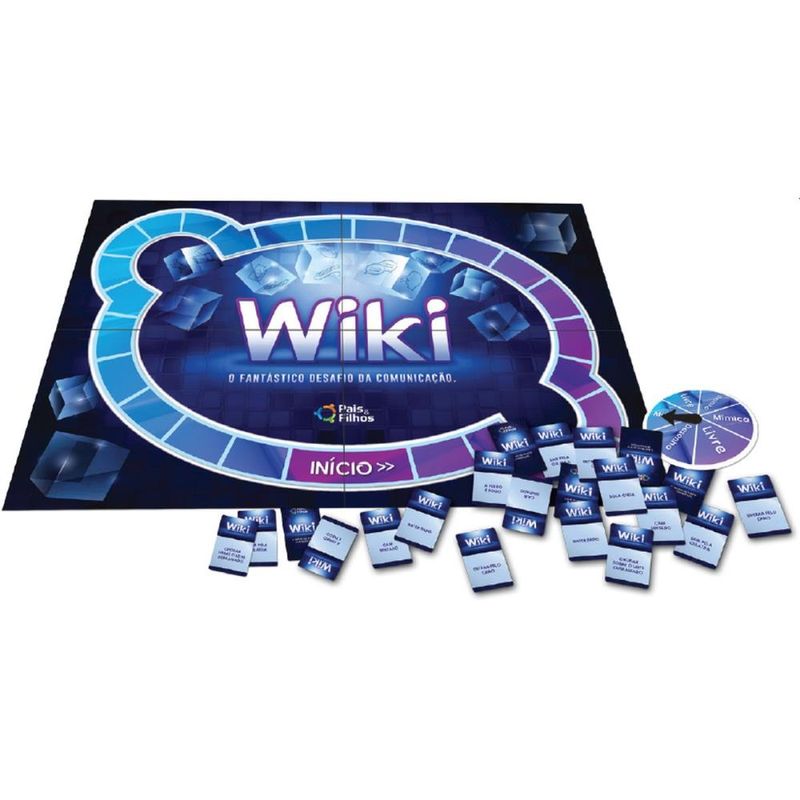 Wiki, de 4 a 8 participantes. Um jogo de desenhos e mímicas para divertir toda a família. Sorteie uma carta e passe a informação para seu parceiro através de mímica ou desenho, de acordo com a roleta. Vence aquele que se expressar rápido e melhor. O fantástico desafio da comunicação. Idade: a partir de 9 anos. Contém 1 Tabuleiro, 780 Cartas, 4 Peões, 1 Roleta e 2 Blocos de rascunhos.