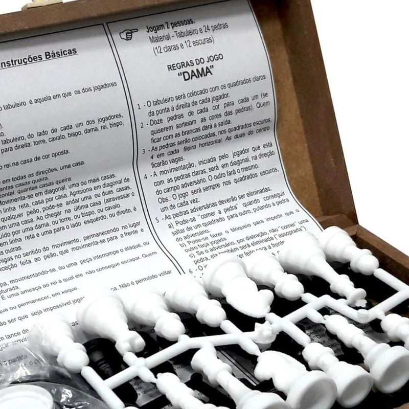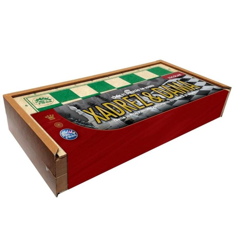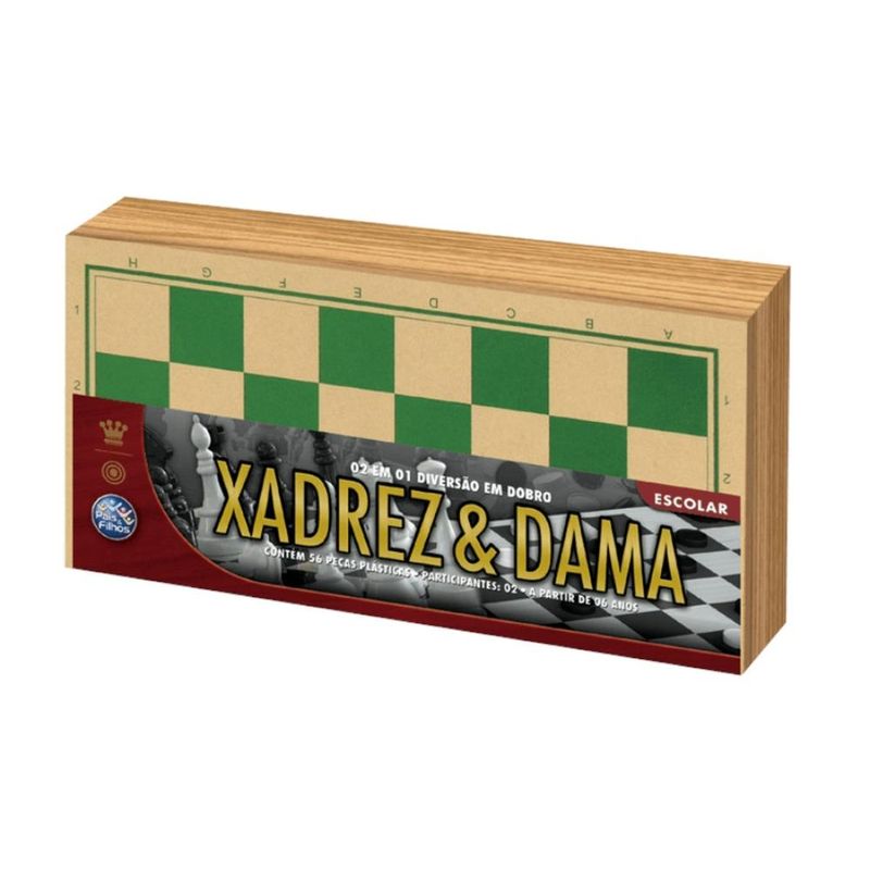 -Jogo Pedagógico onde o Jogador desenvolve Estratégias. -O mais clássico jogo de estratégia e inteligência de todos os tempos, com mais de 500 anos de tradição. -Jogo de Xadrez estimula a criatividade, convívio social, agilidade, e também o raciocínio. -Possui caixa em madeira. Tradicional jogo onde os participantes testam sua estratégia e inteligência. -O brinquedo de dama é projetado para dois jogadores e tem como objetivo capturar todas as peças adversárias ou imobilizá-las. -Além de ser uma atividade divertida para crianças e adultos, o jogo estimula várias habilidades cognitivas. Características: Marca - Pais E Filhos Cód. 2908 Recomendado a partir de 6 anos Para 2 Jogadores Contém 56 Peças Plásticas + Estojo Em Madeira COR DO ESTOJO ENVIADA SORTIDAMENTE