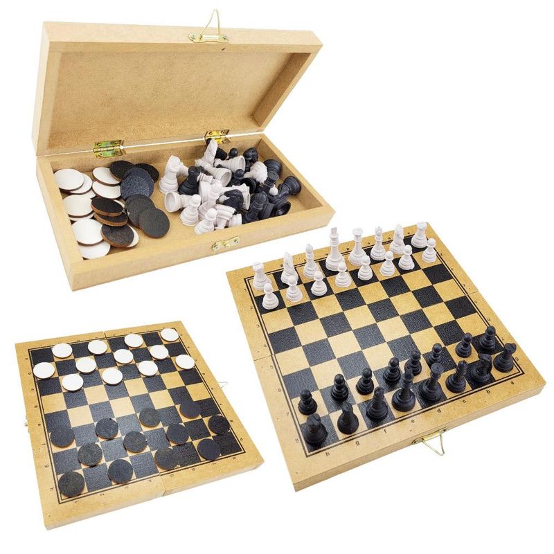 O Jogo de Xadrez e Damas Colegial modelo 1176 da Carlu, acompanha 1 tabuleiro no formato estojo medindo aproximadamente 24cm x 24cm, 32 peças para o Jogo de Xadrez e 24 peças para a Dama, todos acondicionadas na própria caixinha de madeira tipo estojo.