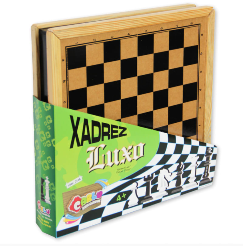 O xadrez auxilia no desenvolvimento do raciocínio lógico, incentivando habilidades de observação, reflexão, análise e tomadas de decisão.Descritivo detalhado:Jogo confeccionado em M.D.F e Madeira.- Estojo/Tabuleiro serigrafado na face externa com tinta atóxica, em quadrantes claros e escuros, com 32 peças para o xadrez (Rei 10cm de altura). Estojo/tabuleiro aberto: 43 x 43 x 8cm.Faixa etária de restrição: menores de 3 anos.Faixa etária recomendável: a partir de 6 anos.Material: M.D.F. e MadeiraEmbalagem: caixa de papel
