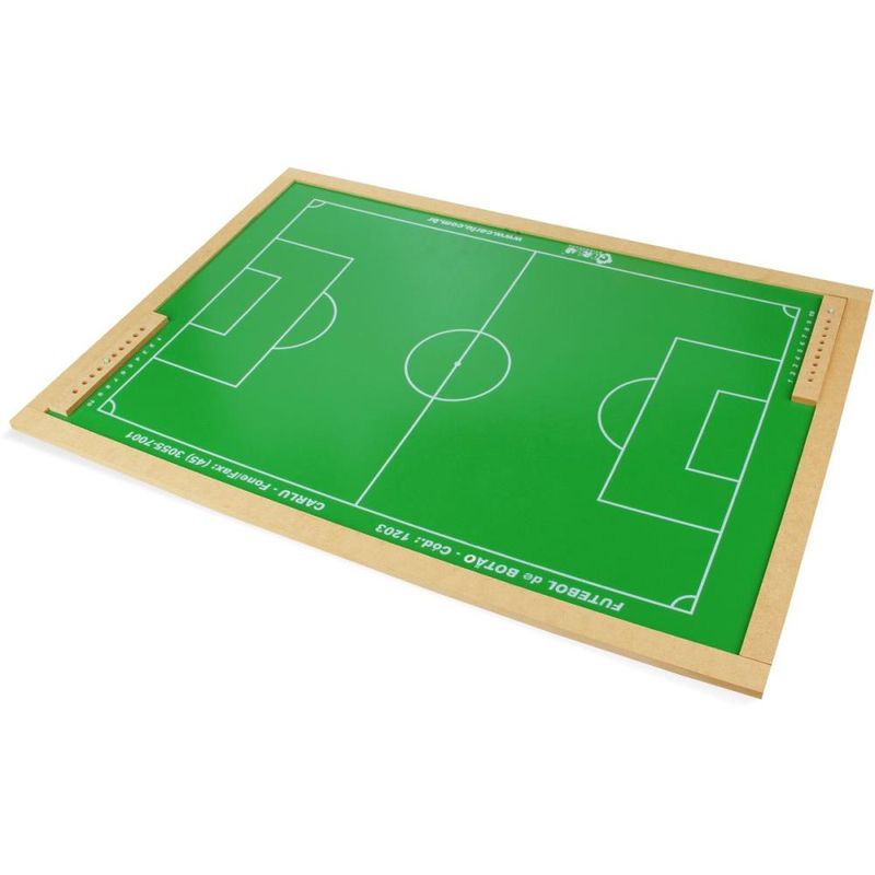 Descritivo detalhada: Confeccionado em M.D.F. imitando um campo de futebol pintado com tinta verde e linhas brancas serigrafadas com tinta ató xica delimintando as áreas do campo. Acompanha 2 pinos de plástico resistente. Medida total do campo 92 x 63 x 3 cm. Embalagem: Papelão.