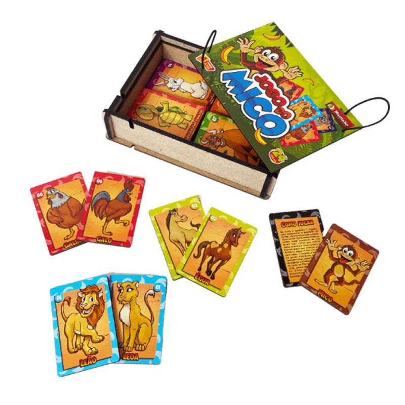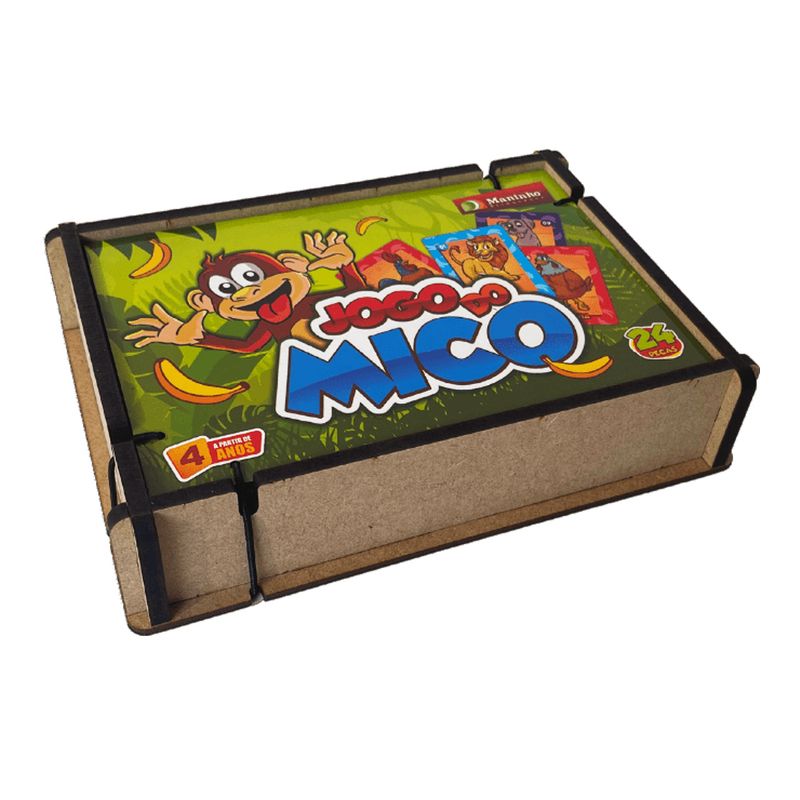 No Jogo do Mico Premium as peças deverão ser embaralhadas e divididas entre os jogadores.Cada jogador deverá comprar uma carta, fazendo os pares com as figuras dos animais e eliminando esses pares de suas mãos. No final quem ficar com a peça do mico perde o jogo e paga o mico. O jogo do mico é um jogo muito divertido e promove a interação pois o ideal é que seja jogado em grupo de amigos. O jogo motiva a curiosidade e desenvolve o raciocínio lógico das crianças pois são incentivados a organizar estratégias para a vitória.Chame seus amigos para brincar! O Jogo do Mico Premium é composto por 1 Caixa de madeira de 23 cm x 16,5 cm x 3 cm + 24 peças de madeiraFabricante: Artesanato ManinhoMaterial: MDF Embalagem: PVC Encolhível Dimensões do produto embalado: 23 cm x 16,5 cm x 3 cmPeso aprox.: 0,900 kg A partir de 4 anos