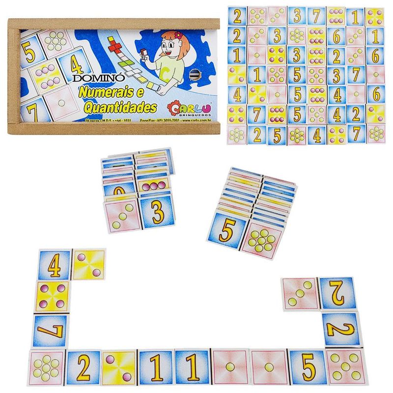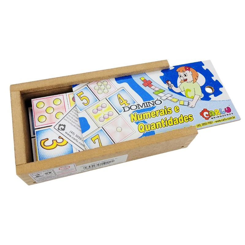 O Jogo de Dominó Numerais e Quantidades modelo 1031 da Carlu, acompanha 28 peças serigrafadas com tinta atóxica medindo aproximadamente 7cm x 3,5cm, todas acondicionadas em uma caixinha de madeira tipo estojo.