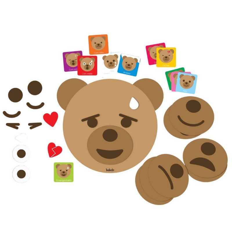 ursinho (26x23cm), 24 peças (expressões) e 12 fichas com sentimentos.