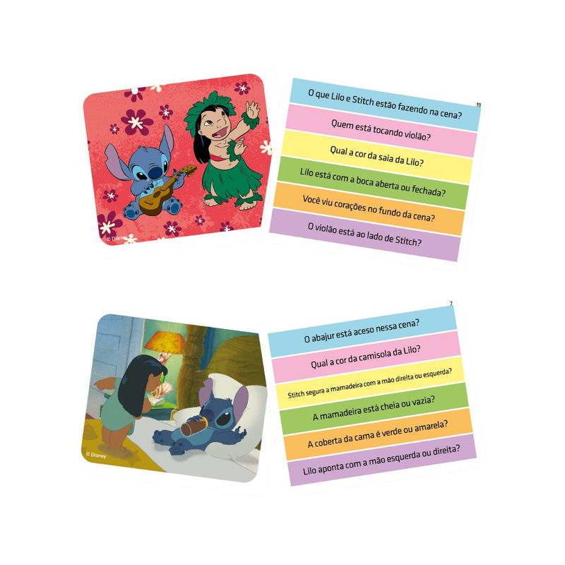 Observar as cenas por alguns minutos e responder às questões sorteadas no dado, respondendo sobre Stitch, Lilo e suas aventuras. São 6 perguntas para cada cena. Esse jogo auxilia o aprendizado infantil, testando a memória e estimulando o desenvolvimento da linguagem. A criança vai nomear as figuras, trabalhando a fala e melhorando o vocabulário. Contém 30 cartas + ampulheta + 01 dado em madeira.