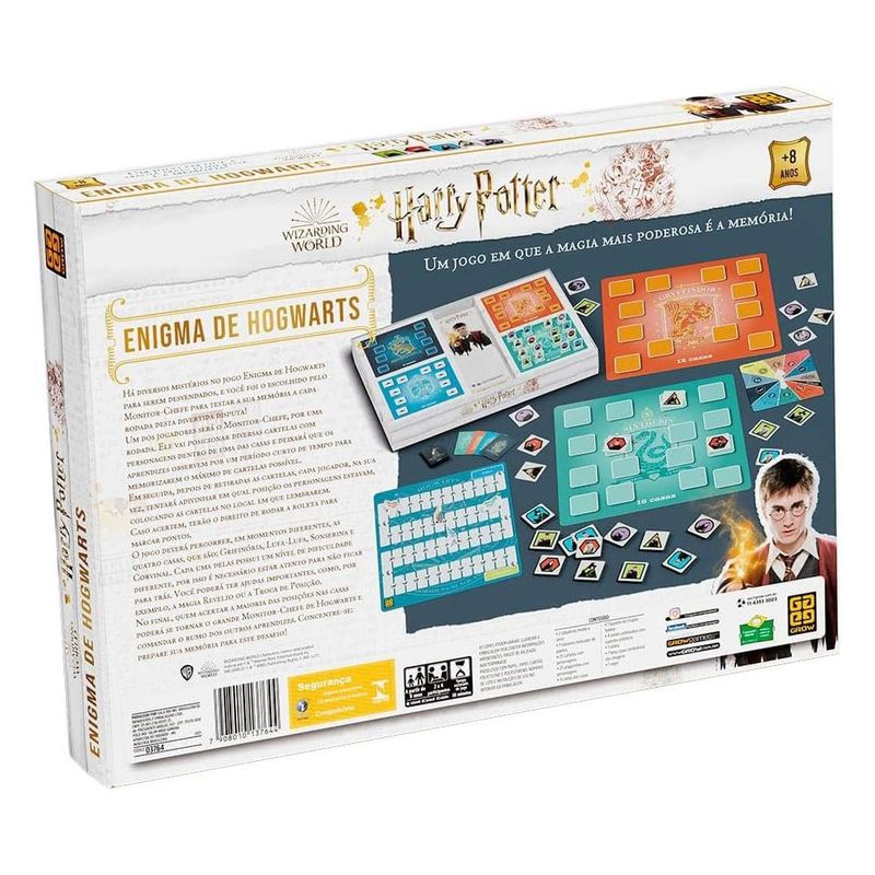 Jogo Enigma de Hogwarts Harry Potter - Grow Jogo Enigma de Hogwarts Harry Potter Há diversos mistérios no jogo do Harry Potter para serem desvendados, e você foi o escolhido pelo Monitor-Chefe para testar a sua memória a cada rodada nesta divertida disputa! Como jogar Enigma de Hogwarts Harry Potter? Concentre-se e prepare sua memória para este fantástico jogo de tabuleiro do Harry Potter! Um dos jogadores será o Monitor-Chefe, por uma rodada. Ele vai posicionar diversas cartelas com personagens de uma das casas e deixará que os aprendizes observem por um período curto de tempo para memorizar o máximo de cartas possível. Em seguida, depois de retiradas as cartelas, cada jogador, na sua vez, tentará adivinhar em qual posição os personagens estavam, colocando as cartas no local em que lembrarem. Caso acertem, terão o direito de rodar a roleta para marcar pontos. O jogo deverá percorrer, em momentos diferentes, as quatro casas do universo Harry Potter, que são: Grifinória, Lufa-Lufa, Sonserina e Corvinal. Cada uma delas possui um nível de dificuldade diferente, por isso é necessário estar atento para não ficar para trás. Você poderá ter ajudas importantes, como a magia Revelio ou a Troca de Posição. No final, quem acertar a maioria das posições nas casas poderá se tornar o grande Monitor-Chefe de Hogwarts e comandar o rumo dos outros aprendizes. Recomendado para bruxinhos a partir de 8 anos, um manual de instruções com todas as regras acompanha o mágico jogo de cartas e de tabuleiro. Especificações Técnicas: Idade: A partir de 8 anos Participantes: 2 a 4 jogadores Tempo estimado de jogo: 30 minutos Dimensões da Embalagem: 38 x 27 x 5,5 cm Certificado Inmetro: CCE-BRI/ICEPEX-N 01264-25