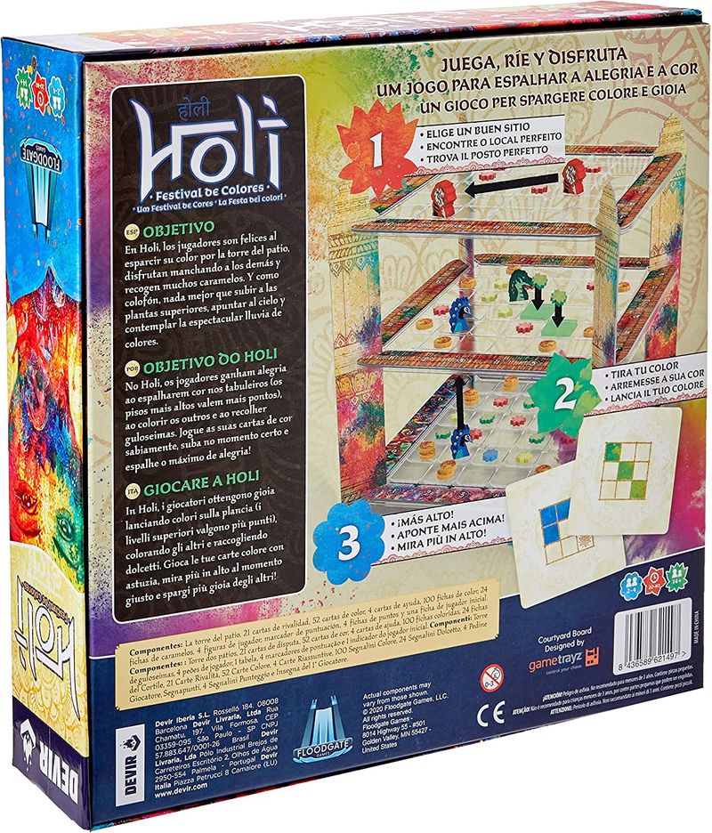 A cada primavera, uma multidão reúne-se para espalhar cor e felicidade durante um dos mais vibrantes festivais da Índia. Juntamente com os seus amigos, andem pelo recinto do festival e arremessarem o pó colorido “gulal” uns nos outros e na multidão. Aponte para cima e deixe a sua cor cair das alturas sobre o maior número de pessoas possível. Isto porque o Holi é o momento onde travessuras divertidas e um pouquinho de rivalidade amigável são exatamente o que o festival precisa! No Holi, os jogadores ganham alegria (pontos) ao arremessarem cor nos tabuleiros (os pisos mais altos valem mais pontos), ao colorirem os outros e ao recolherem guloseimas. O jogador que tiver mais pontos quando mais ninguém puder arremessar cores será o vencedor.