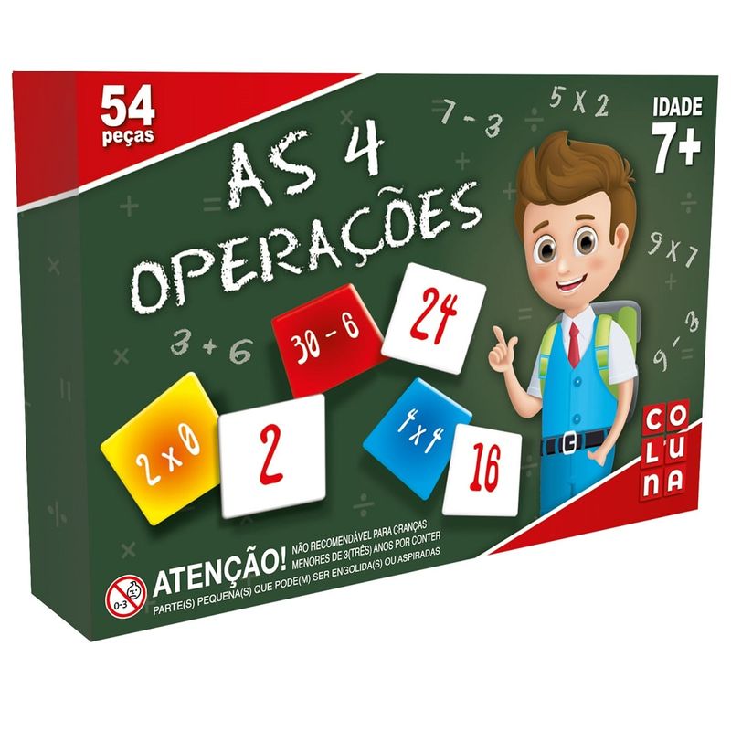 Aprender ficou muito mais divertido com o jogo as 4 operações! Jogo educativo que auxilia o aprendizado das operações matemáticas utilizando cards coloridos. Contém:54 peças Idade: acima de 4 anosMaterial: Papel cartão Certificado Inmetro: CE-BRI/ICEPEX-N 01264-25