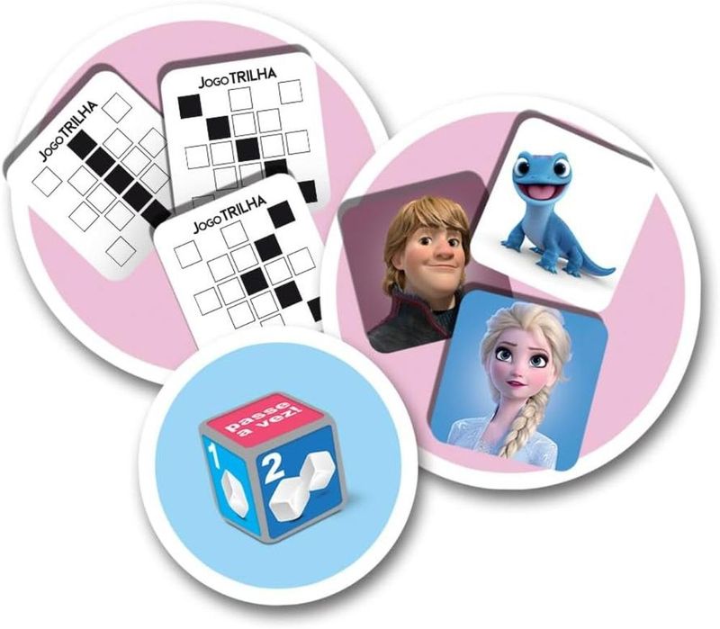 -Um jogo de sorte, estratégia e os personagens favoritos de Frozen. -O Objetivo do jogo é montar 5 imagens do seu personagem sorteado, na sequência que está na sua carta de trilha. -O dado especial indica os movimentos de cada jogador a cada lance, e tudo pode mudar! -Vence quem completar o desafio em 3 rodadas. Características: Marca - Elka Cód. 1232 Idade: + 5 anos Material: Plástico Para 2 Jogadores