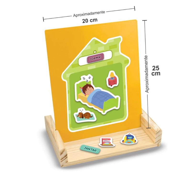 Aviso: Imagens meramente ilustrativas!!! Criar uma rotina ajuda a criança e entender o que vem antes e depois em seu dia-a-dia, aumenta sua confiança e desenvolve a autonomia. Com o quadro Minha Rotina, a criança vai fazer uma linha do tempo com as cartinhas de atividades (acordar, escovar os dentes, tomar café ?). A partir daí, ela vai repetir a cena no painel de metal, colocando as peças de imã de acordo com cada atividade. Contém: 40 peças que podem ser usadas na frente e no verso do painel. Idade: 3+ anos REF: 0466 Marca: Nig Brinquedos Material: Madeira Reflorestada e Metal