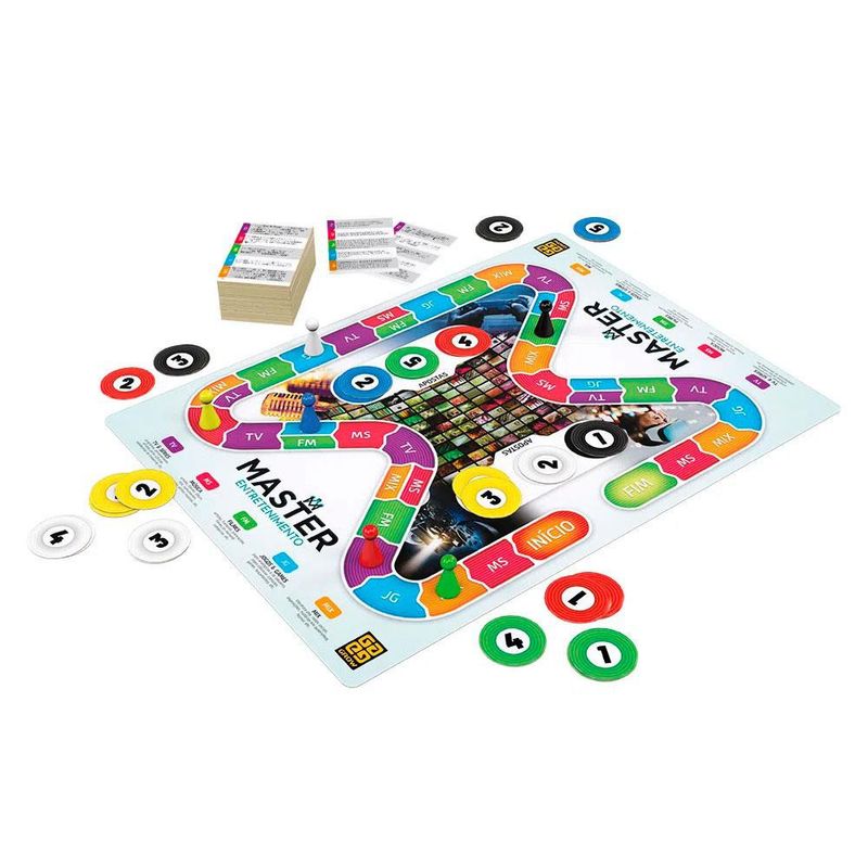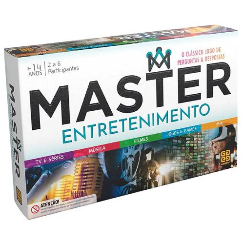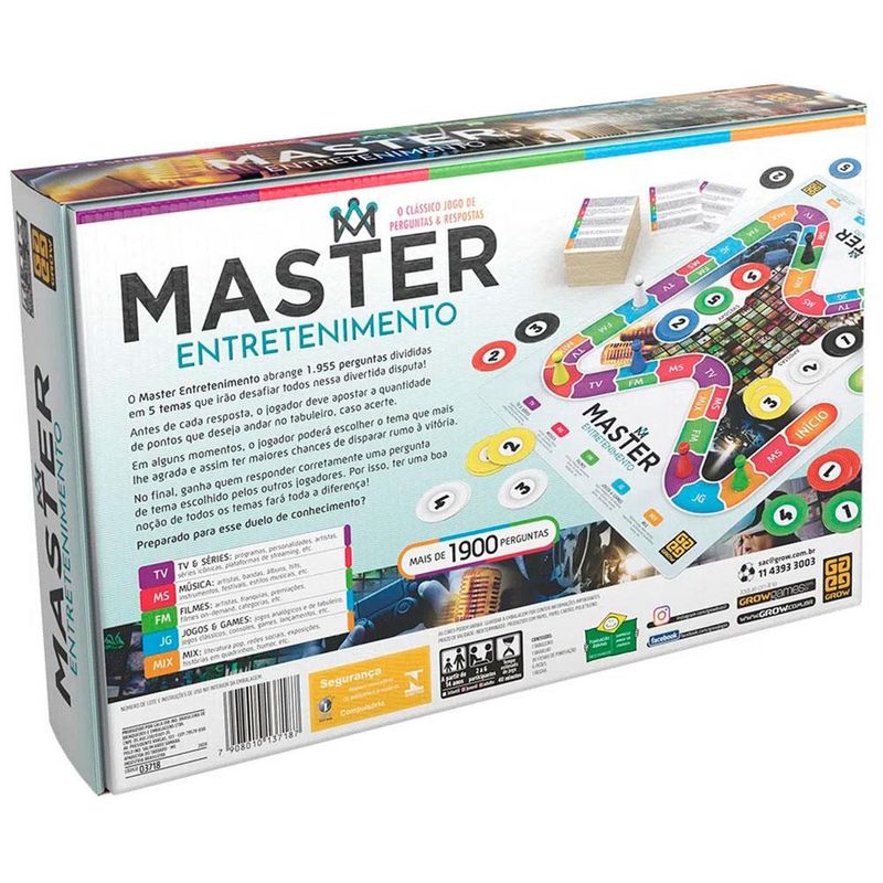 Preparado para esse duelo de conhecimento? O Jogo Master Entretenimento 3718 Grow traz 1.955 perguntas divididas em 5 temas: TV Séries, Músicas, Filmes, Jogos Games e MIX. Antes de cada resposta, o jogador deve apostar a quantidade de pontos que deseja andar no tabuleiro, caso acerte. Em alguns momentos, o jogador poderá escolher o tema que mais lhe agrada e assim ter maiores chances de disparar rumo à vitória. No final, ganha quem responder corretamente uma pergunta de tema escolhido pelos outros jogadores. Por isso, ter uma boa noção de todos os temas fará toda a diferença.