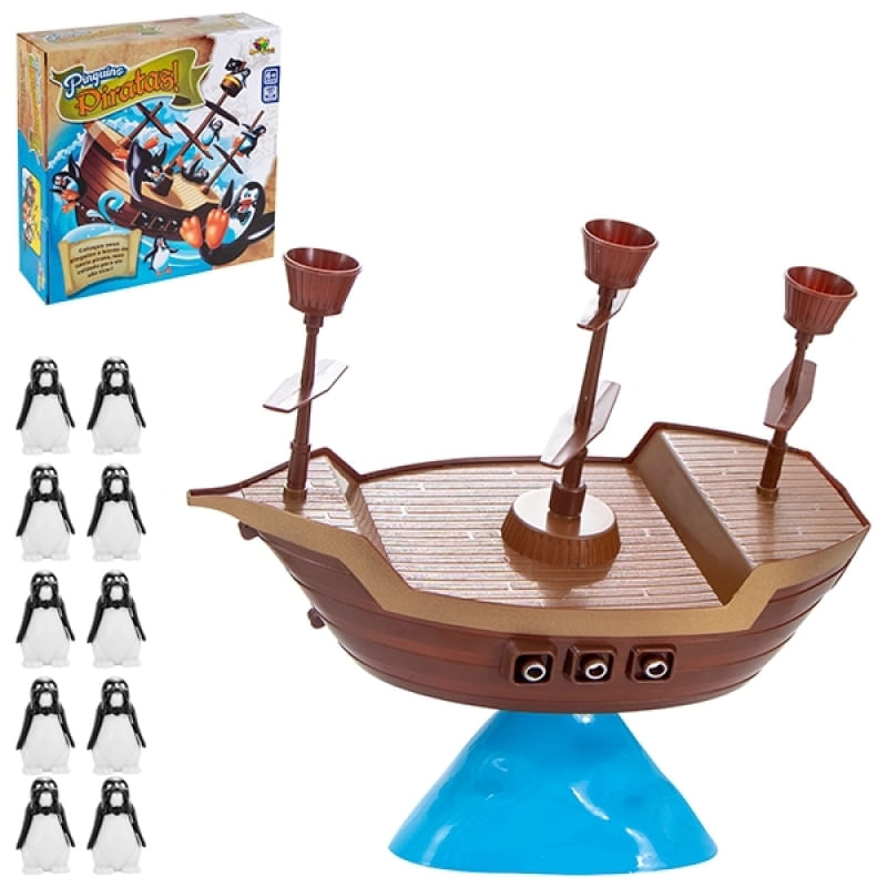 O jogo do Pirata Equilíbrio é divertido e cativante, não caia nas armadilhas do seu oponente, coloque seus pinguins a bordo do navio pirata, mas cuidado para ele não virar. Para brincar com sua família e amigos, cada jogador deverá colocar um pinguim de pé em qualquer lugar do barco, tomando muito cuidado para não desequilibrar seu navio e derrubar os pinguins. Aquele que balançar o navio e derrubar os pinguins perde o jogo.