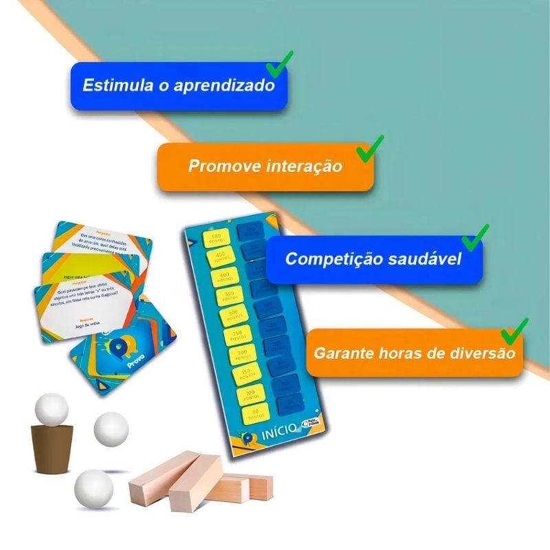 - Conteúdo da Embalagem: Cartas, bolas, copos, blocos de madeira e um placar divertido