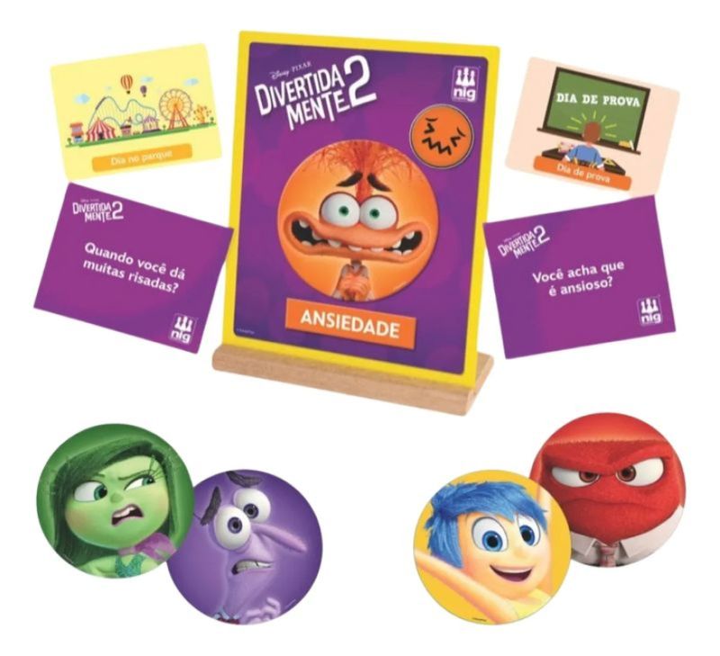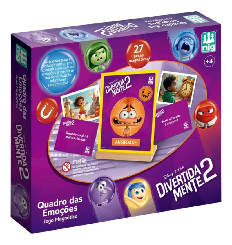 No jogo das emoções divertidamente cada cartinha terá uma cena onde a criança vai identificar o sentimento envolvido. A partir daí, ela monta na placa de metal seu quadro de emoções escolhendo as peças de imã. São 27 peças magnéticas: 09 placas de Divertidamente - Alegria + Tristeza + Medo + Vergonha + Nojinho + Tédio + Raiva e Ansiedade; 09 placas com os nomes das emoções e 09 placas com os emojis de cada uma. No verso das cartas, perguntas para falar um pouco mais sobre os sentimentos de cada um.