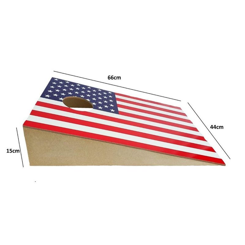 A plataforma do jogo Saco no Buraco da Papi Brink é em MDF, com a rampa completamente adesivada, o que favorece o deslizar dos saquinhos.