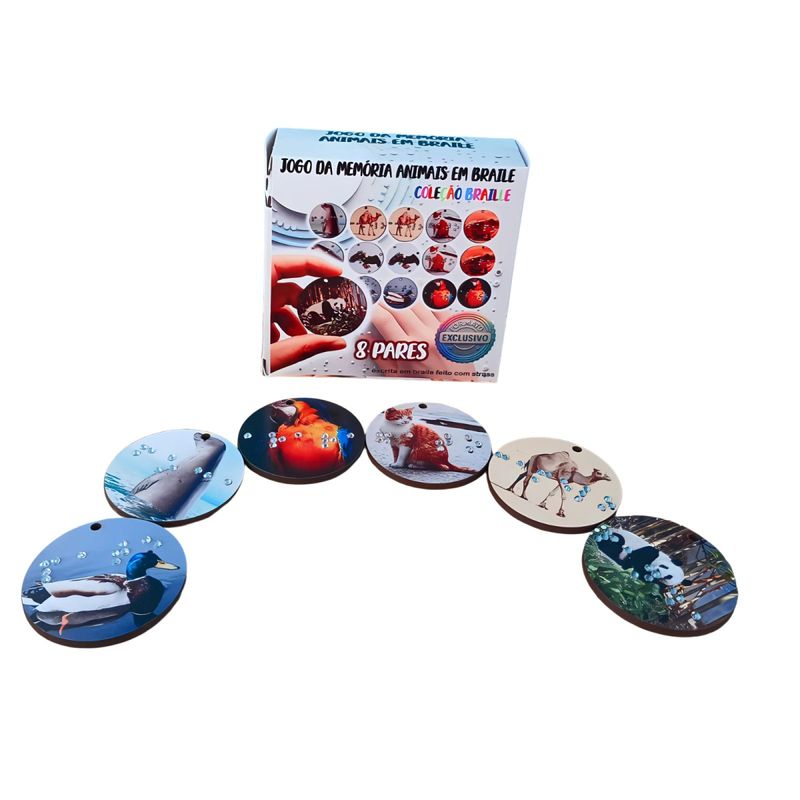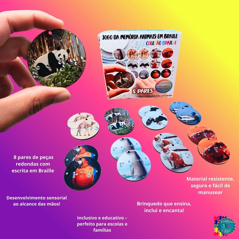 - 8 pares de peças redondas com imagens reais de animais e relevo em Braille feito com strass para fácil leitura tátil