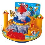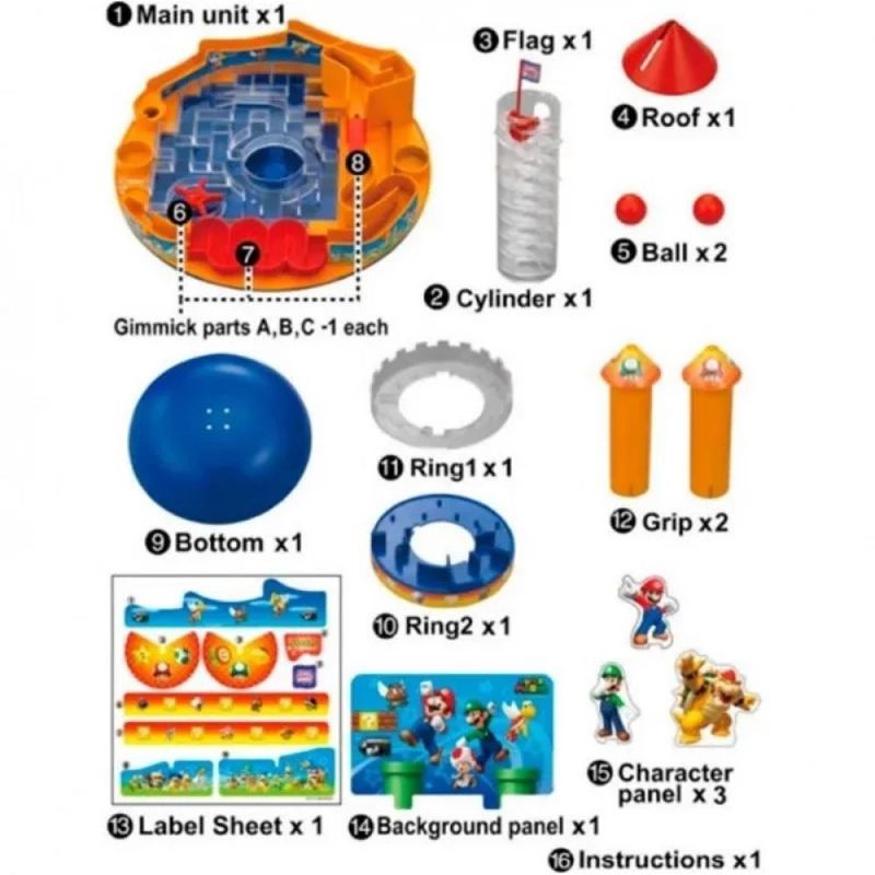 :: Conteúdo da embalagem: 1 pôster com imagens de Super Mario e personagens, adesivos, bases com adesivos de personagens x5, bolas para explorar o labirinto x2, bandeiras x2, joystick, plataforma para colocar as peças do labirinto, peças em forma de labirinto x4, acessórios para a torre .