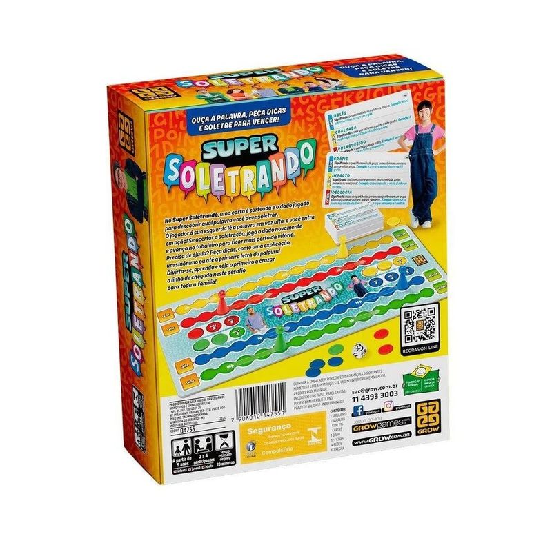 Soletrar nunca foi tão divertido! O Jogo Super Soletrando da Grow é um desafio cativante para toda a família, onde aprender e se divertir andam lado a lado. O Jogo Super Soletrando, fabricado pela renomada marca Grow, é um envolvente jogo de tabuleiro que estimula a memória, o vocabulário e a ortografia, promovendo o desenvolvimento da linguagem de maneira lúdica. Elaborado principalmente com papel e projetado para proporcionar horas de diversão educativa