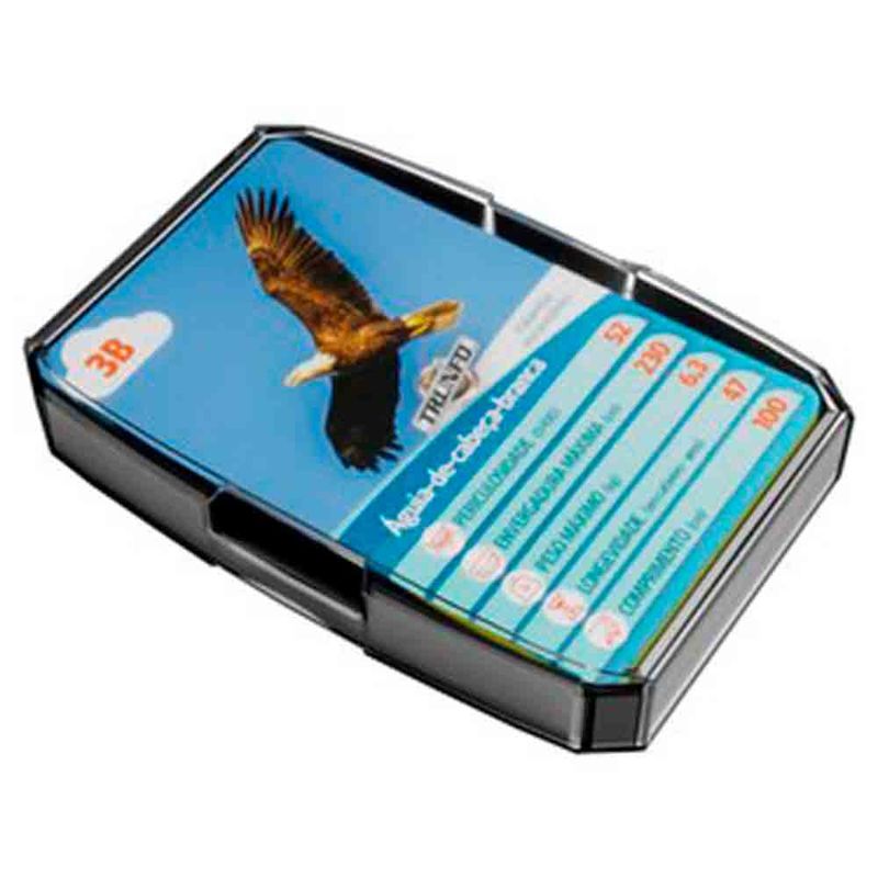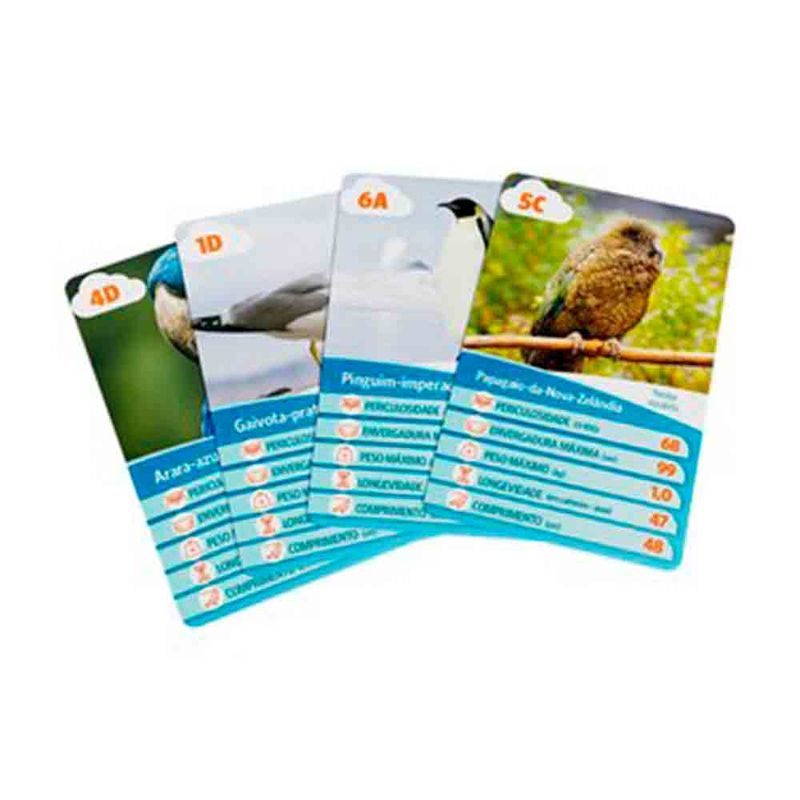 Neste jogo de cartas para crianças, são 32 espécies com nome científico, periculosidade, envergadura máxima, peso máximo, longevidade e comprimento.
