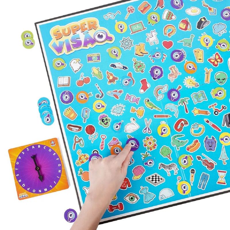 Ative sua Super Visão e encontre o mais rápido possível no tabuleiro uma imagem que comece com a letra sorteada. Pronto! Você conquistou uma imagem.