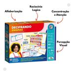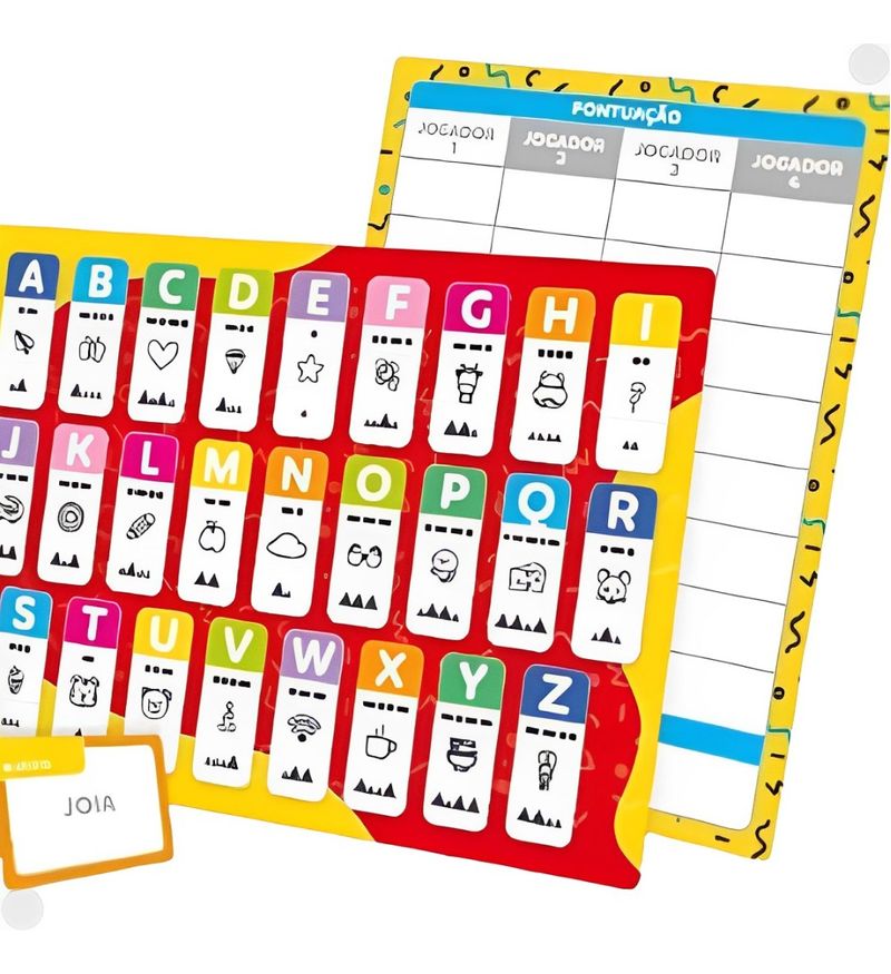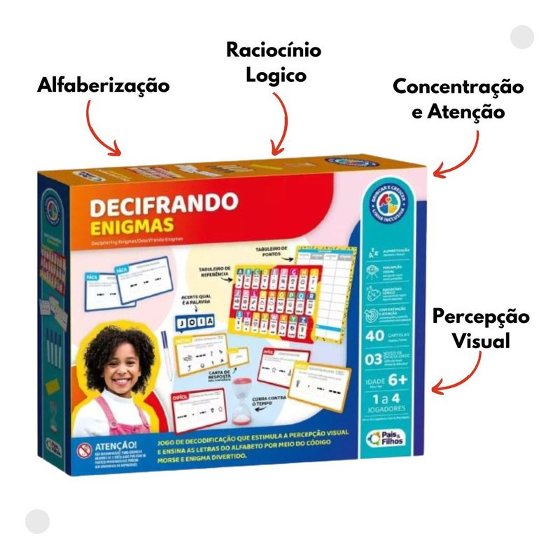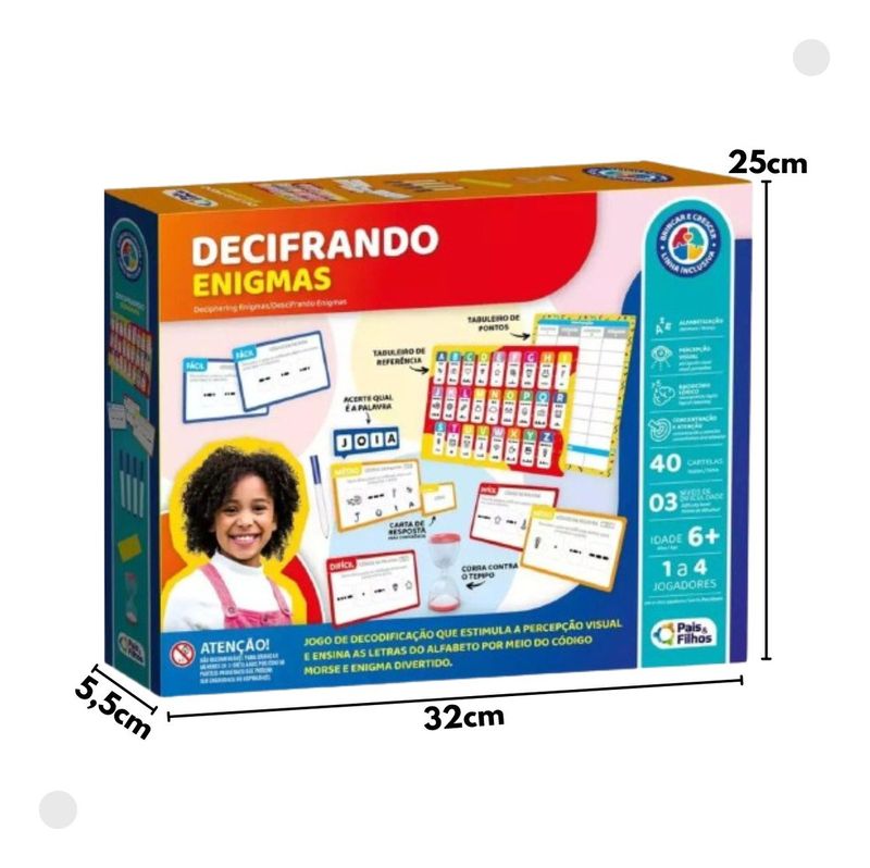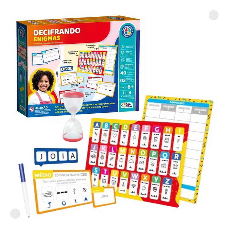 DESCRIÇÃO DO PRODUTO:Decifrando Enigmas é um jogo de decodificação que estimula a percepção visual e ensina as letras do alfabeto por meio do código Morse e enigma divertido. Ideal para desvendar o mistério das palavras codificadas, trabalha habilidades como percepção visual, alfabetização, raciocínio lógico, concentração e atenção.CARACTERÍSTICAS TÉCNICAS:Conteúdo da Embalagem: 40 cartelas de desafios, 40 cartas de respostas, 01 tabuleiro de referência (alfabeto), 01 tabuleiro de pontos, 01 ampulheta, 04 canetinhas dry eraser, 01 apagador (felty) e 01 regra.Dimensões Aproximadas da Embalagem: 8 cm x 26 cm x 34 cm (Altura x Largura x Comprimento/Profundidade)Material/Composição: Papel Cartão, Poliestireno, Vidro, Butadieno, Microesferas e TecidoIdade Mínima Recomendada: A partir de 6 anosParticipantes: A partir de 1 pessoaMarca: Pais e FilhosReferência: 792406Outras informações: As cores podem variar entre as imagens mostradas e o produto. Imagens meramente ilustrativas.
