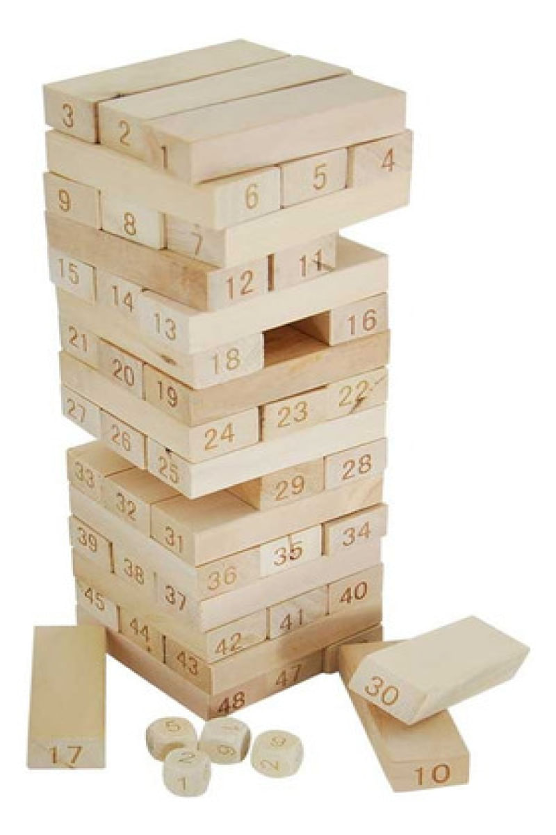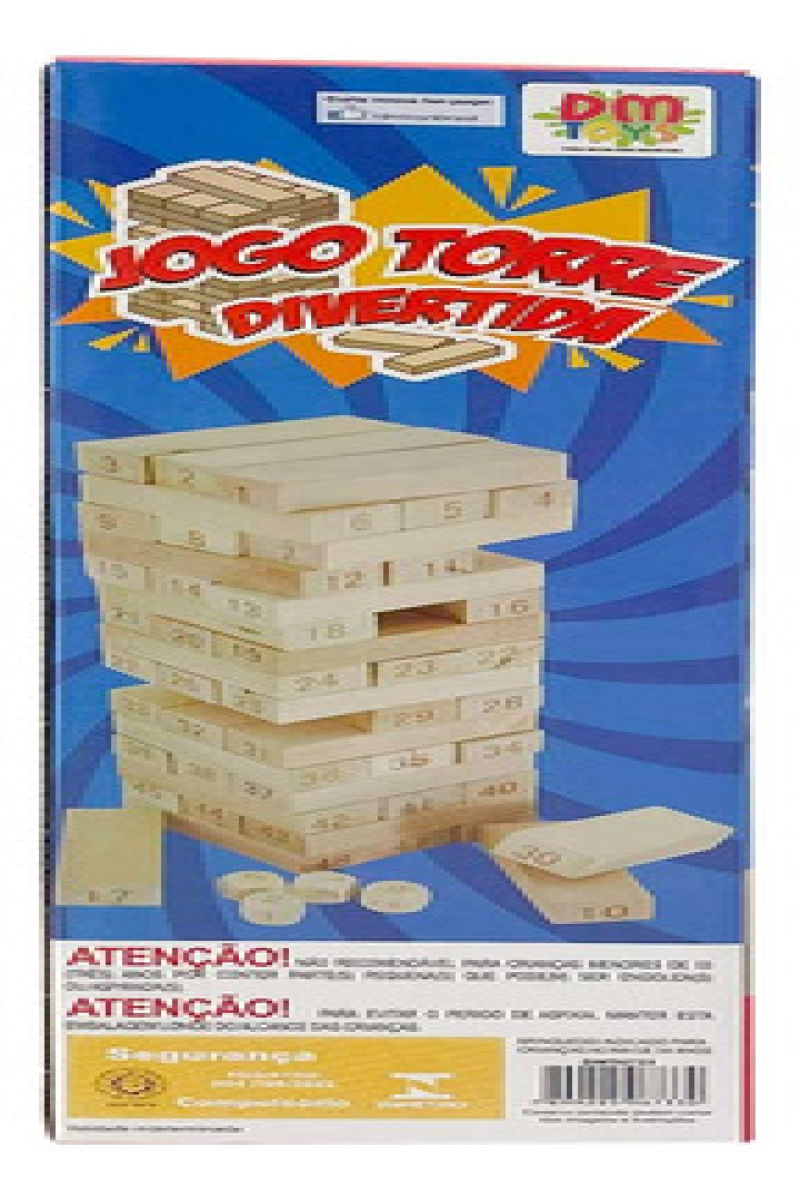 Jogo torre divertida da Dm Toys com 54 pçs e 4 dados de madeira,uma excelente opção para toda familia com muita diverção garantida.