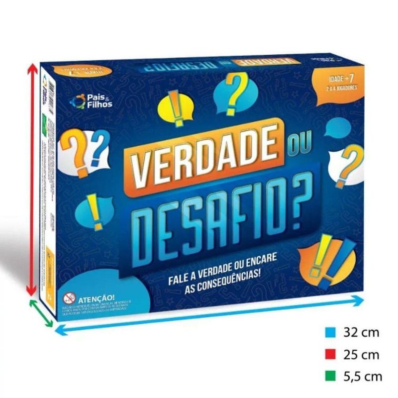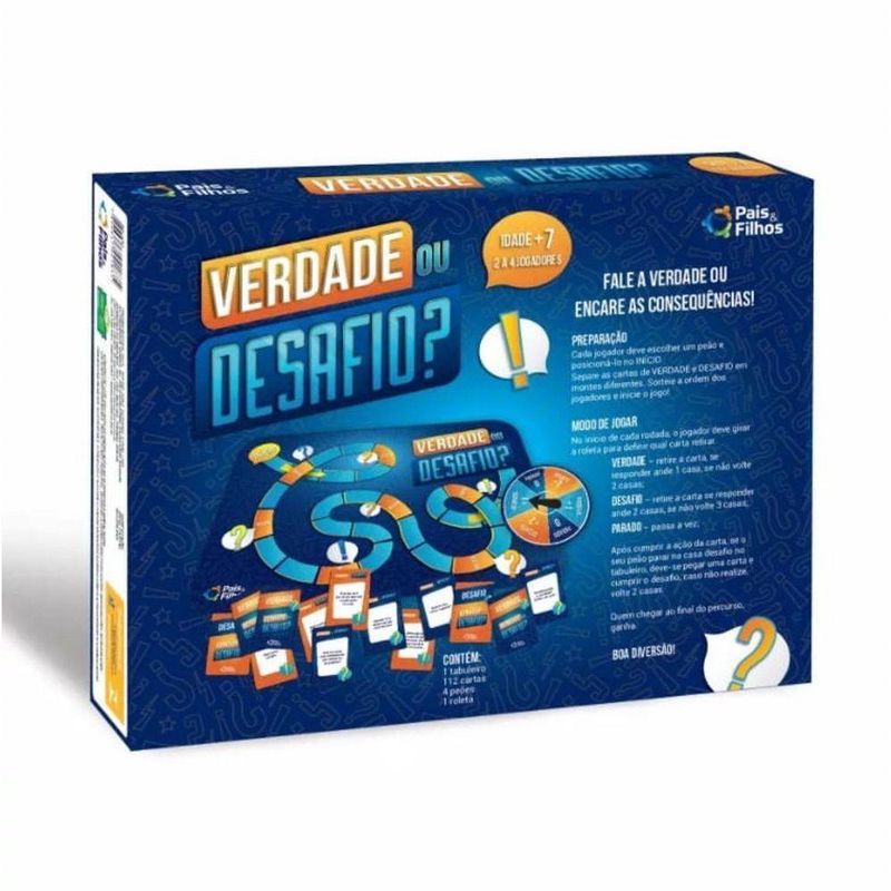Jogo Verdade ou Desafio da marca Pais e Filhos. Fale a verdade ou encare as consequências! Cada jogador deve escolher um peão e posiciona-lo no início. Separe as cartas de verdade e desafio em montes diferentes. Sorteie a ordem dos jogadores e inicie jogo! Cada jogador deve girar a roleta para definir qual carta retirar. Venha se divertir com esse jogo incrível!