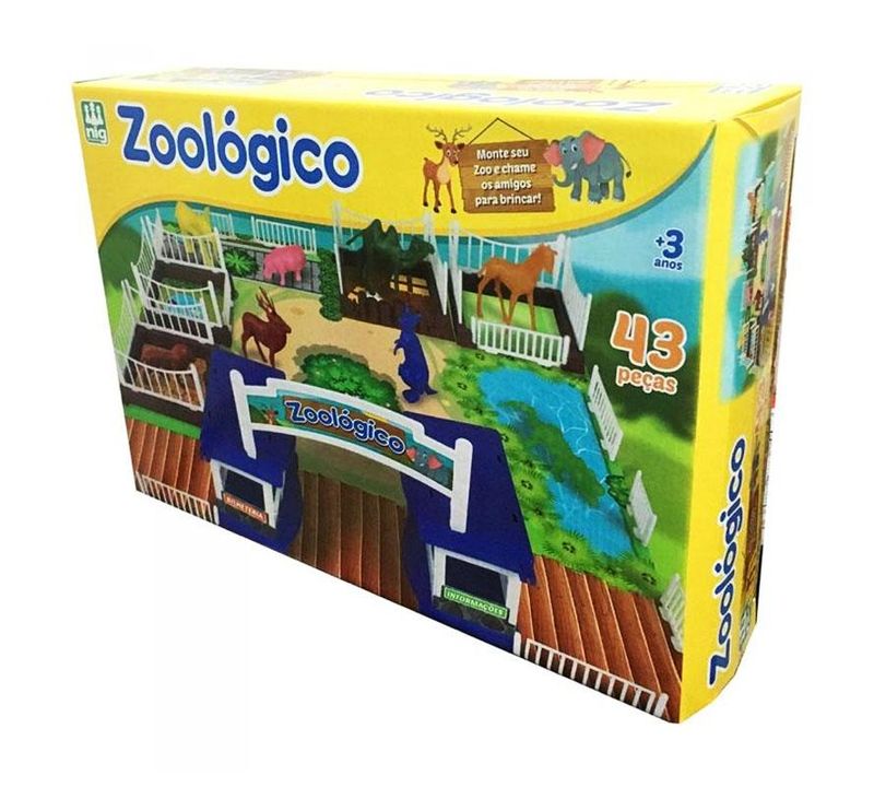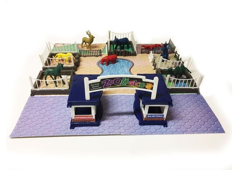 Brincando, as criancas vao montar o Zoo da Nig em tabuleiro decorado com lagos e vegetacao, guarita plastica para a entrada, 4 jaulas, cerquinhas e tambores. Sao oito animais!