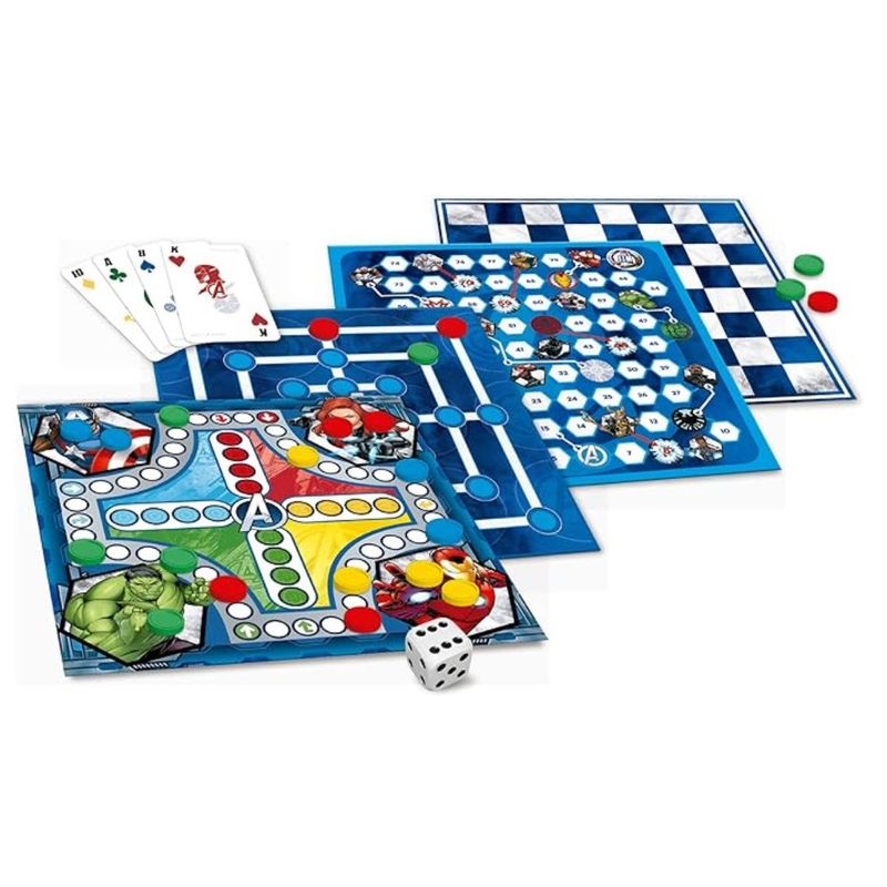 São 4 jogos de tabuleiro com temática dos Vingadores (Dama, Ludo, Trilha e Sobe e Desce) e um baralho personalizado e exclusivo para você jogar com toda sua família ou amigos!