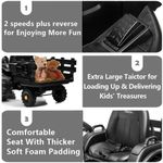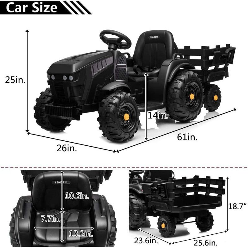 Rápido Possui grande potência. As rodas são muito onduladas, por isso percorre quase todos os terrenos. Lida com colinas muito bem. Projetado com funções de avanço e ré e duas velocidades 3 a 7 km, h para ajuste, as crianças vão adorar dirigir o trator com bateria por conta própria e obter mais entretenimento